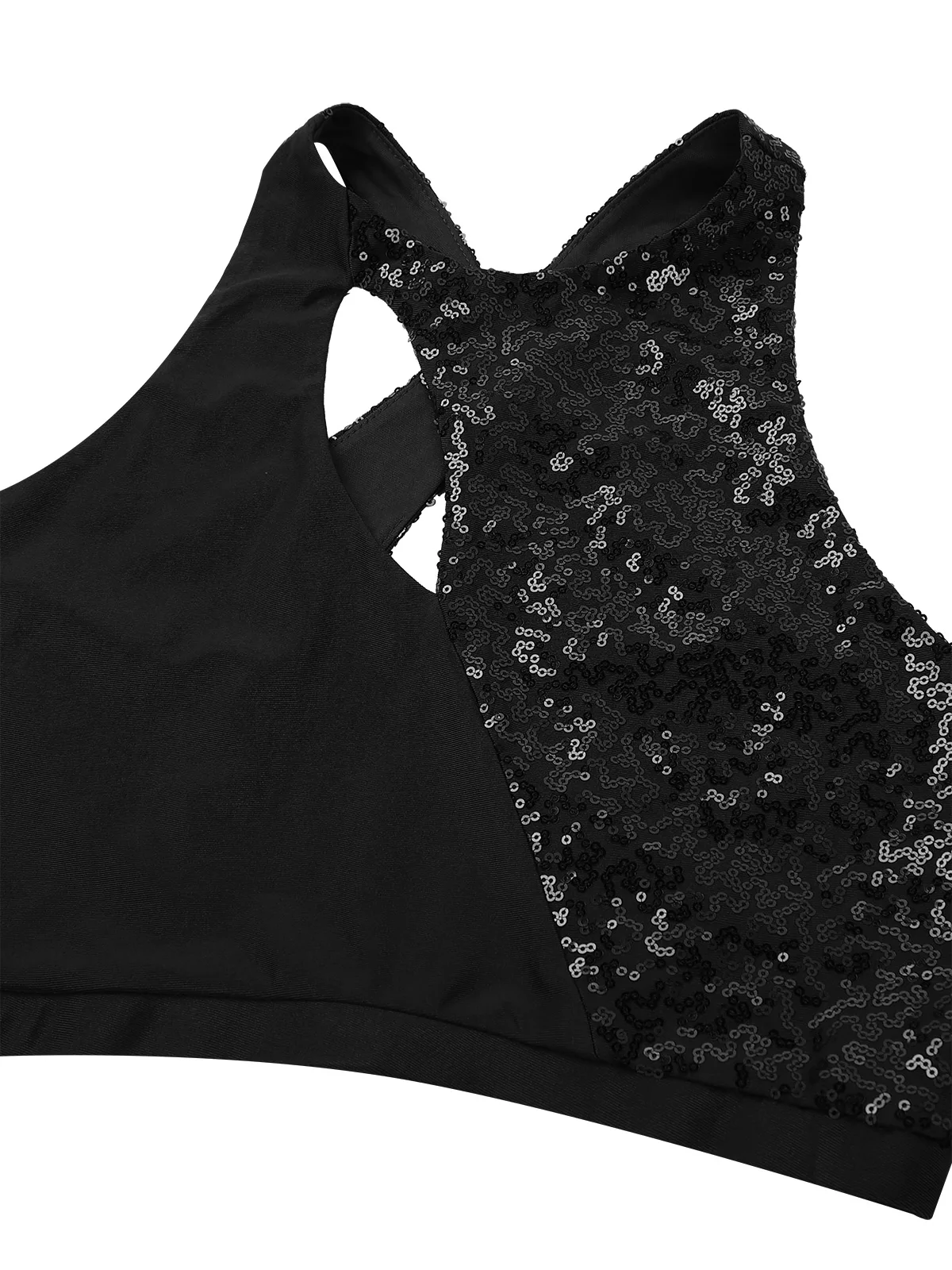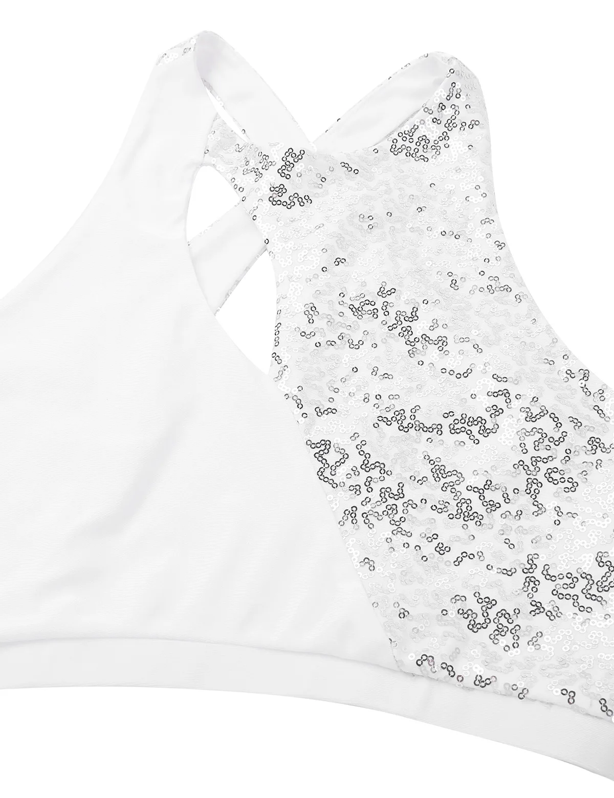 Укороченный топ на бретелях с ассиметричными пайетками для корсета, с вырезами спереди, перекрещивающимися бретелями сзади.
