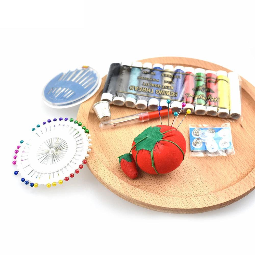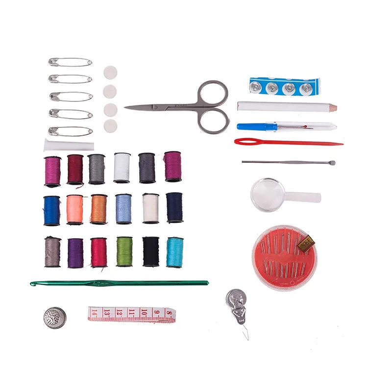 Посылка включает в себя: 30xSewing Иглы (в том числе черного ящика) 6x швейная нить (смешанные цвета) 10 кнопок (смешанные цвета) 100X защитных штифтов (смешанные цвета) 1xSeam Ripper (втягиватель) 2x шпульки для ниток 2xneedles винторезный станок 2xthimble 1xCase 1xscissors