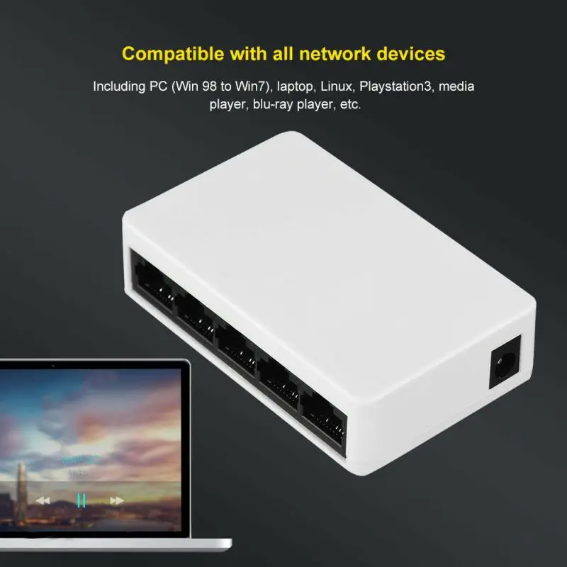 Особенности: 1.The 5-портовый коммутатор используется для того, чтобы добавить больше порт к маршрутизатору или подключения к сети. 2. Подключи и играй. Драйвер не требуется. Подключите оптоволоконный Кот к телеприставной коробке IPTV. 3. совместимость со всеми сетевыми устройствами, включая ПК (для Win 98-Win7), ноутбук, для Linux, для медиаплеера, Blu-Ray плеера, и т. д. 4.The 5 портов 10/100 Мбит/с коммутатор для высокоскоростной сети Ethernet обеспечивает 5 10/100 Мбит/с адаптивной RJ45 порт. Улучшите производительность сети до полнодуплексной передачи данных. 5. Скорость переключения скорости провода для пересылки пакетов может быть такой же быстрой, как сеть, передающая им пакеты. 6. Он подходит для многих видов сцен, таких как семья, кампус и офис. 7. Когда кабельный порт является недостаточным, вы можете использовать этот коммутатор, чтобы продлить кабельный порт и свободно поделиться сетью. 8. Это мини-сетевой коммутатор. Он имеет 5 портов, что более удобно в использовании. Скорость передачи может достигать 10 Мбит/с/100 Мбит/с. Полный/полудуплексный адаптивный порт, 10 м/100 м двойная скорость Самоадаптация. Подключи и играй, драйвер не требуется. Спецификация: Тип: сетевой переключатель Материал: пластик Цвет: белый номера портов: 5 Порт поддержка соглашение: IEEE 802,3, IEEE 802.3u, IEEE 802.3x, IEEE 802.3az сетевой Средний: 10Base-T, три или более типа s UTP 10Base-TX, пять типов s скорости передачи UTP: 10 Мбит/100 Мбит/с режим передачи: Полный/полудуплексный Самоадаптация скорость передачи: 3,3 В/1A, 3,3 В AUX/100мА, 5 В/5A и 12 В/500 м Светодиодный индикатор: 10/100 Мбит/с (link/act) питание (блок питания) Источник питания и Потребляемая мощность: вход DC5V/500mA Максимальная потребляемая мощность: 1,5 Вт Размер продукта: прибл. 81x51x21 мм/3,2x2x0,8 дюйма Вес: 59 г в упаковке: сумка Примечание: Из-за разницы в экране цвет может немного отличаться от того, что вы ожидаете, пожалуйста, оставьте в упаковке: 1 сетевой коммутатор 1 Инструкция по эксплуатации