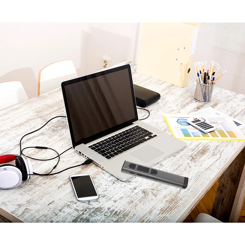 С зеленой указкой, может позволить всем в комнате фокусироваться на важных точках Вашего PPT и сделать вашу речь более превосходной; Беспроводной ведущий с usb-приемником, магнитной присоской, может храниться в авторучке.