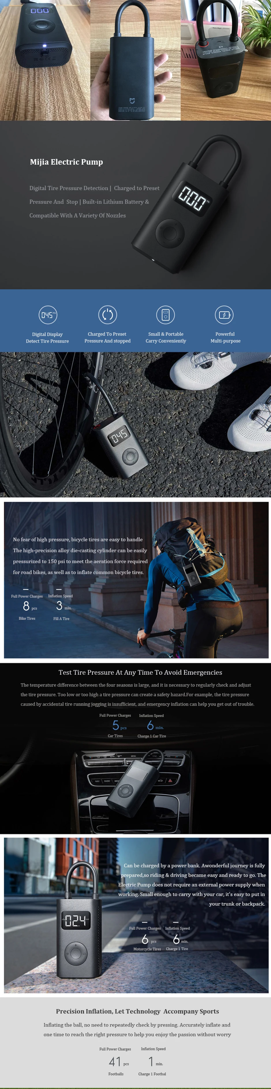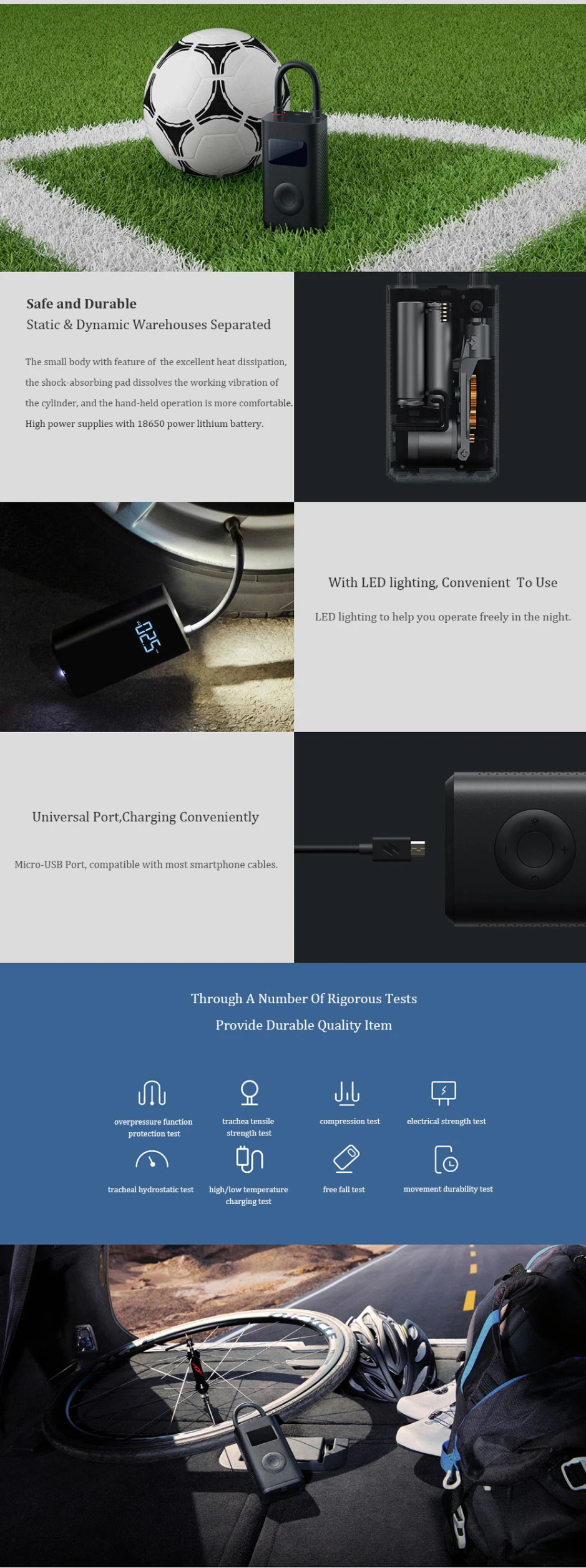 Наименование: электрический насос Mijia Температура хранения:-10 ℃---45 ℃ Размер: без airpipe 124x71x45,3 мм Интерфейс зарядки: Micro-USB Параметры зарядки: 5 В = 2 А Диапазон давления: 0,2-10,3 бар/3150psi Емкость аккумулятора: 2000 мАч (14.8Wh) Sensoraccuracy: t2psi Время зарядки: меньше] than3hours Рабочий шум: шум менее 80 дБ от 1 метра Рабочая температура: Зарядка: 0oC45C, разряд:-10C45C Размер trasheal: Тяговая вытягивающая длина 180 мм, включая насадку (без резьбы) адаптера