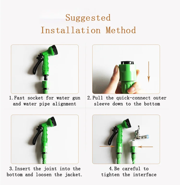 1. Водопроводная труба имеет волшебную функцию автоматического телескопического расширения в 3 раза: она может автоматически продлеваться на 3 раза после полива и автоматически убирается до исходной длины после выключения воды.