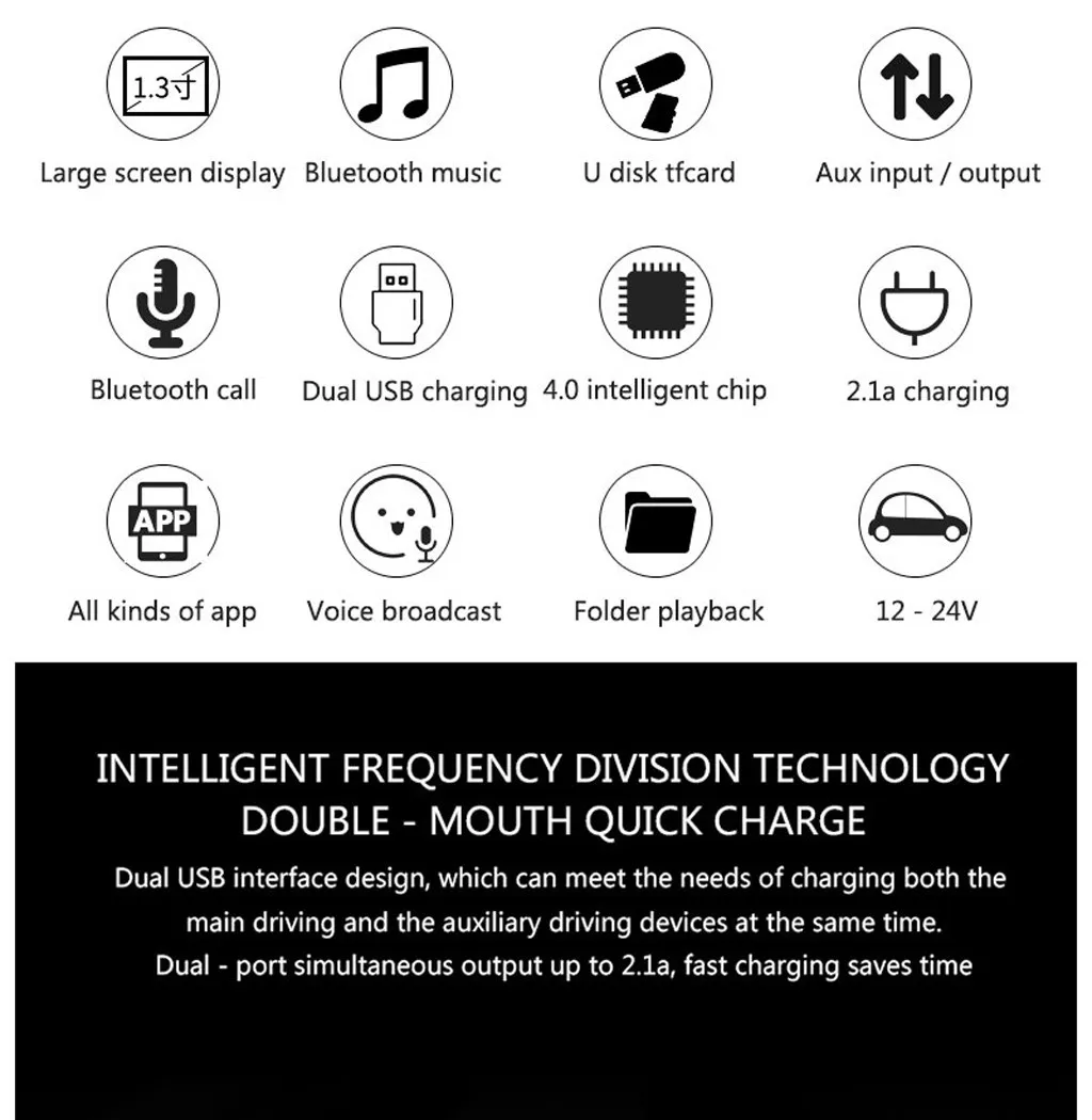 Описание:BT версии 4,0, поддержка BT вызова громкой связи, BT Передача музыки, идентификатор звонящего; Поддержка TF карты (Micro SD карты) / USB флэш-плеер (функция считывания), Поддержка формата MP3 / WMA; Двухзарядный usb-порт DC5V / 2.1A расширяемые портативные устройства особенности для всех Мобильные телефоны, планшеты и другие электронные зарядные устройства; 1,3 Светодиодный дисплей с точечной матрицей, отображение частоты, имя файла и статус Работа с информацией; Поддержка меню UMA Настройка языка, режим воспроизведения и режим звука; Память поддерживает сбой питания и воспроизведение папок; AUX Функция ввода и вывода; Автомобиль Индикация напряжения батареи; FM Частотный диапазон: от 87,5 МГц до 108 МГц Функция автоматического отключения памяти Поддерживаемые языки: китайский, английский, французский, испанский, немецкий, португальский, Итальянский, Голландский, шведский, русскийСпецификация: