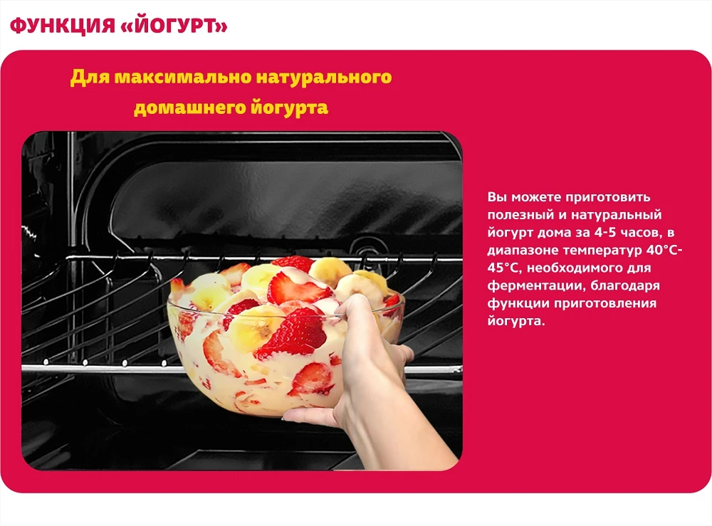 Cooking modes upper heating/Upper + Lower heating/Lower heating/oven cleaning/yogurt mode