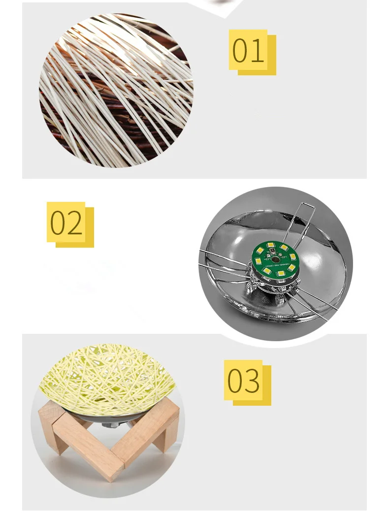 Размер: 15*15*20 см Светильник источник света: 8 светодиодный бусины Материал: абажур из ротанга + основание из цельного дерева Режим управления: градиент цвета