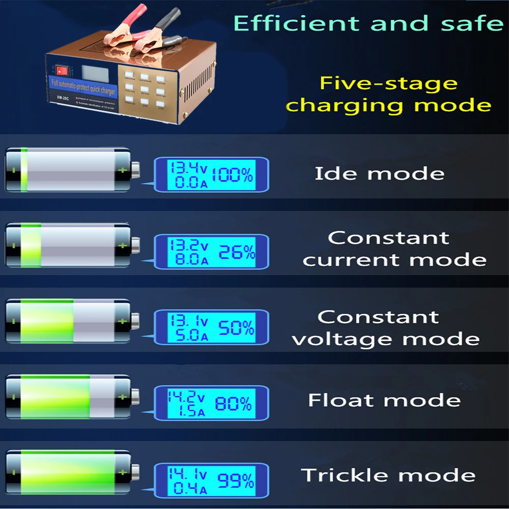 Параметры Входное напряжение: 110-230 В Выходное напряжение: 12 В/24 В Ток: 12А пик для 12В, 10А ПИК для 24В Capatity: 100AH Мощность: 160 Вт Частота: 50-60 Гц Длина выходного провода: 65 см Длина входного провода: 125 см Размер: 14*19*7 см Вес брутто: 0,9 кг Применение: лучше всего подходит для 40-120AH свинцово-кислотных батарей (включая влажные и сухие)