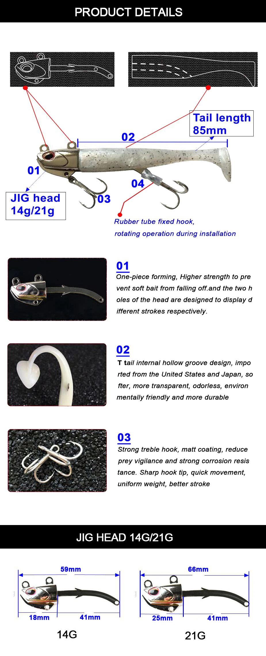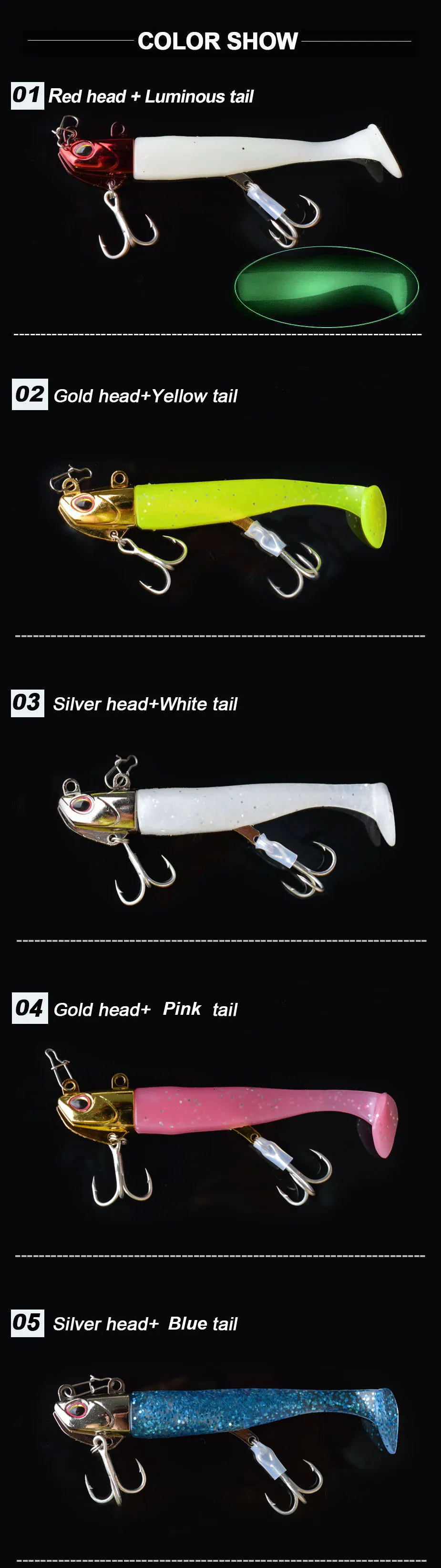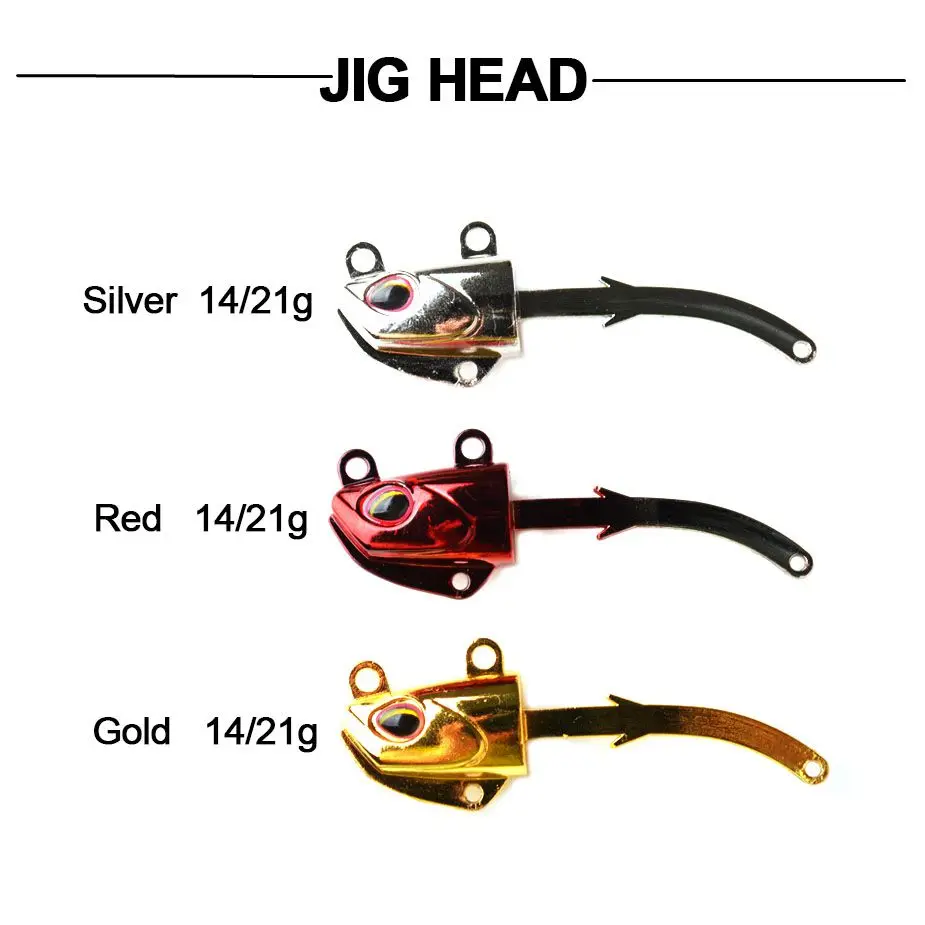 Бренд: TOMA Модель: джиг-голова для рыбалки, мягкая японская блесна Вес головки Джига: 14 г 21 г Длина хвоста: 85 мм Материал головки Джига: металлический цинковый сплав Материал хвоста: импортный ПВХ Цвет наконечника: золотой, серебряный, красный Цвет хвоста: желтый, белый, светящийся Рисунок: покрытие Крючок: 2 комплекта крепкий тройной крючок Подходит: пресноводная/морская/Береговая/лодка для рыбалки