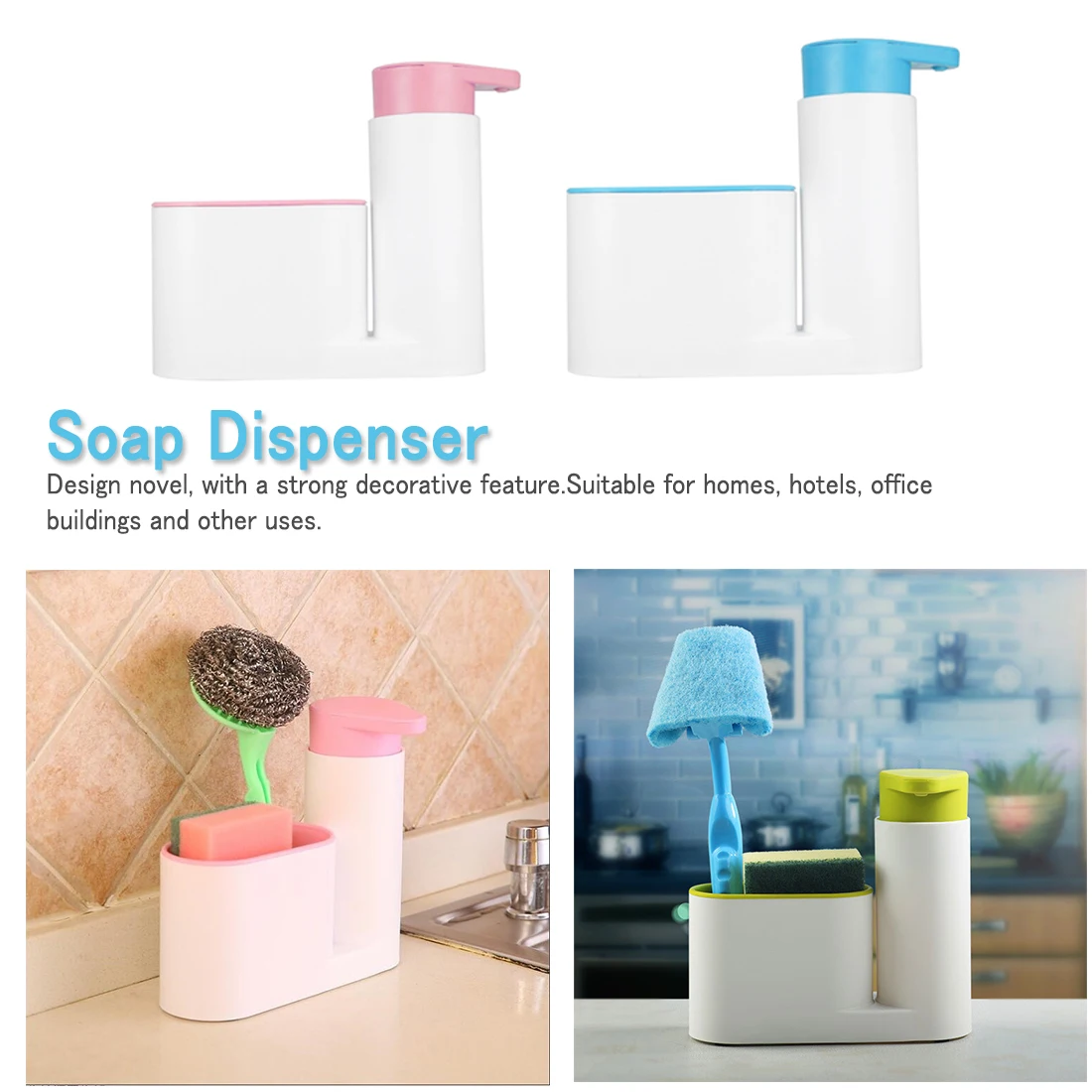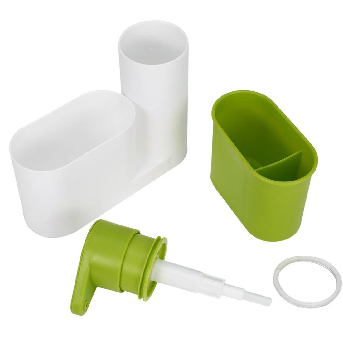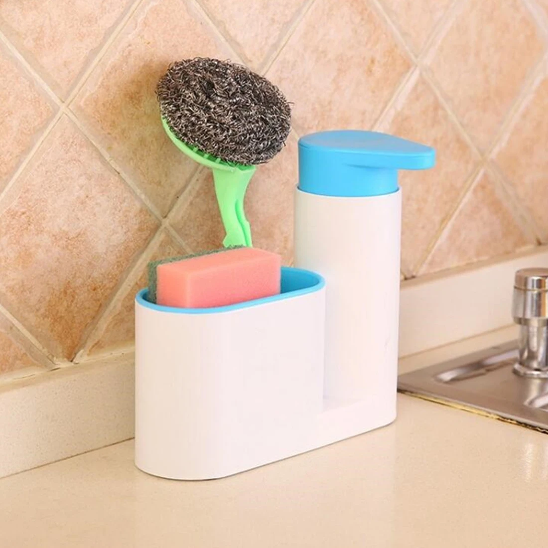 Диспенсер имеет многофункциональное использование. Используется для хранения губки для мытья, дозатора моющего средства для мойки и стойки для дезинфицирующего средства для рук.