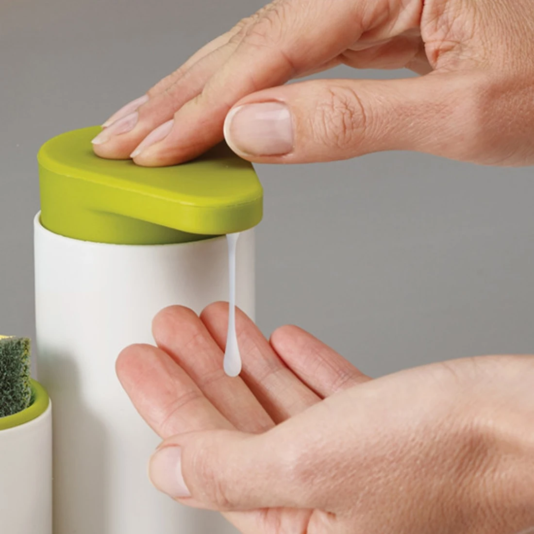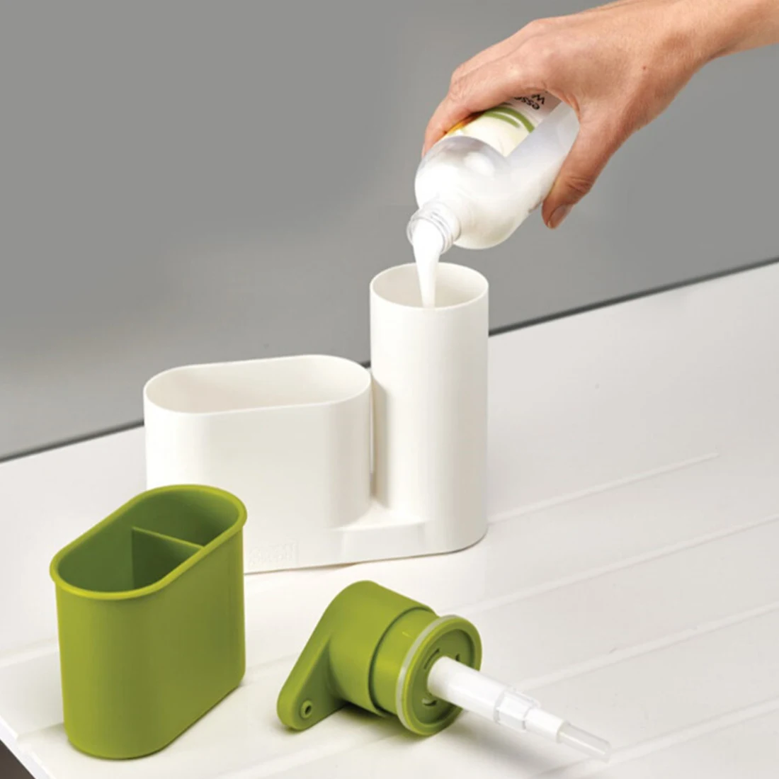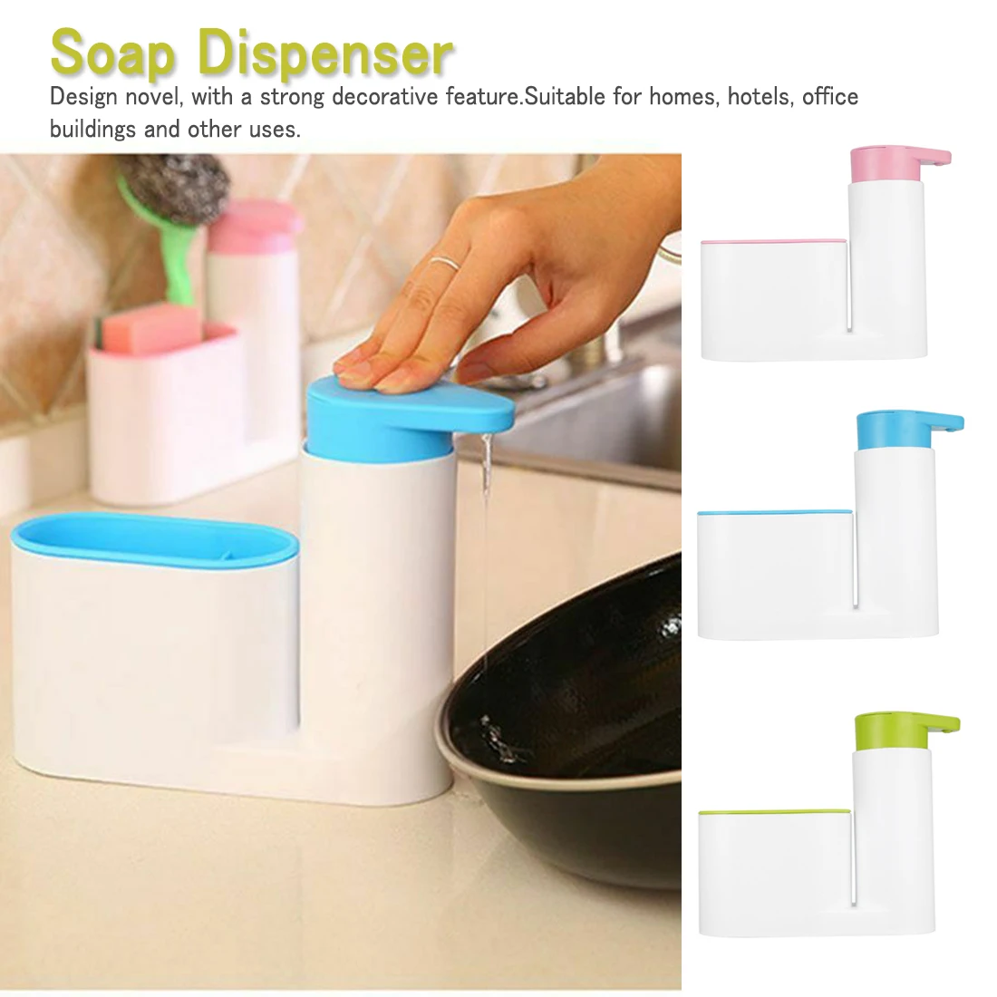 Диспенсер имеет многофункциональное использование. Используется для хранения губки для мытья, дозатора моющего средства для мойки и стойки для дезинфицирующего средства для рук.