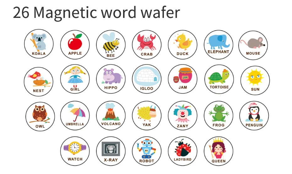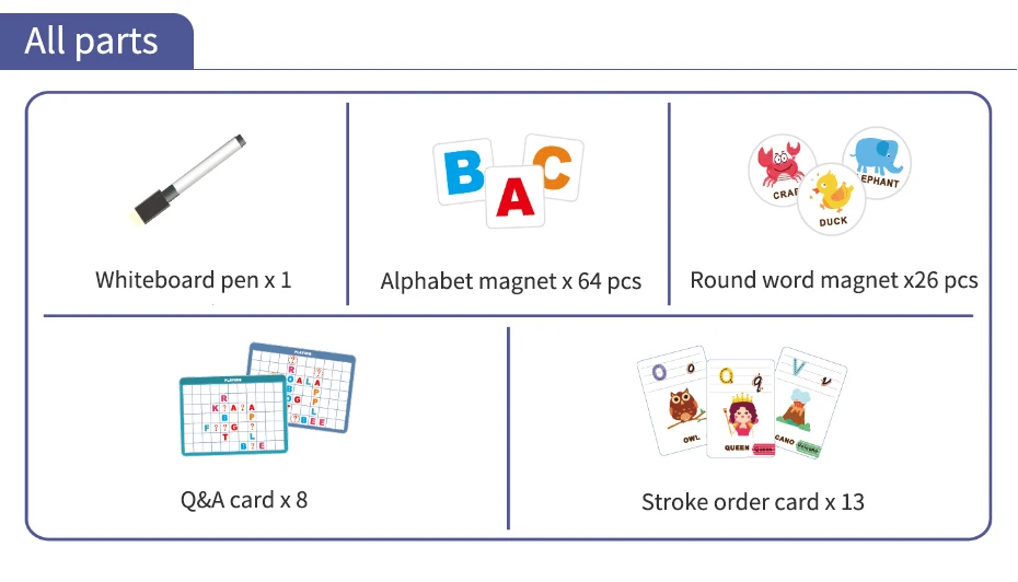 Ручка для белой доски X1 Алфавит на магнитах x64 Круглый магнит x26 Q & A card x8 Карточка для заказа хода x13