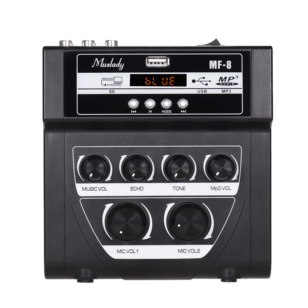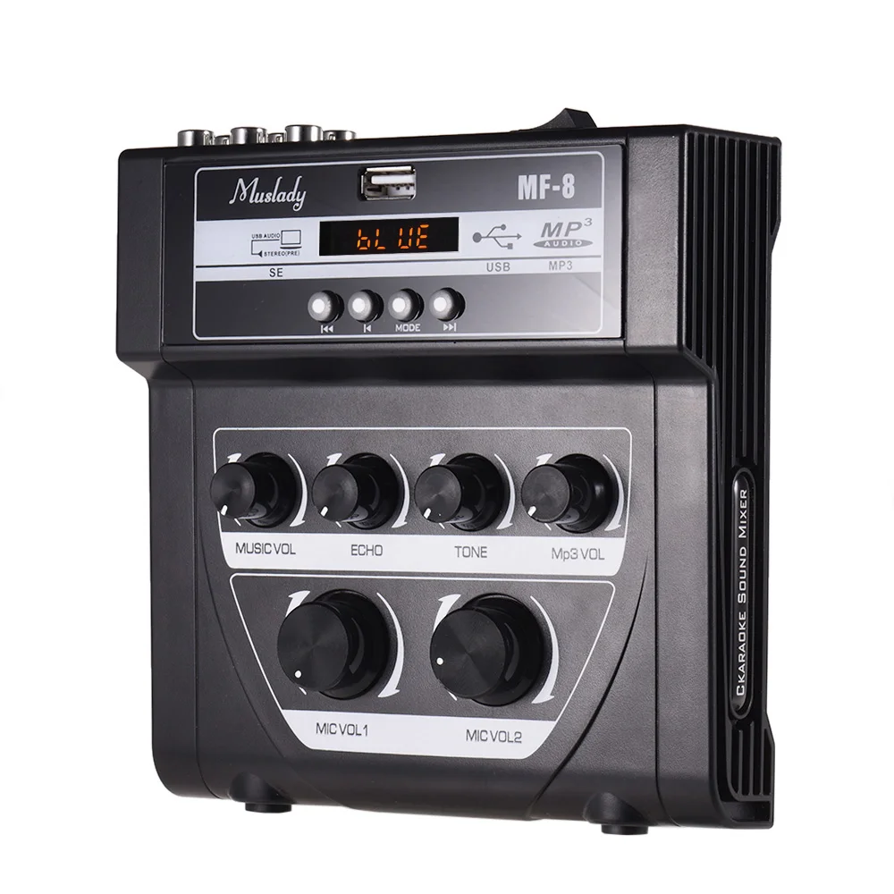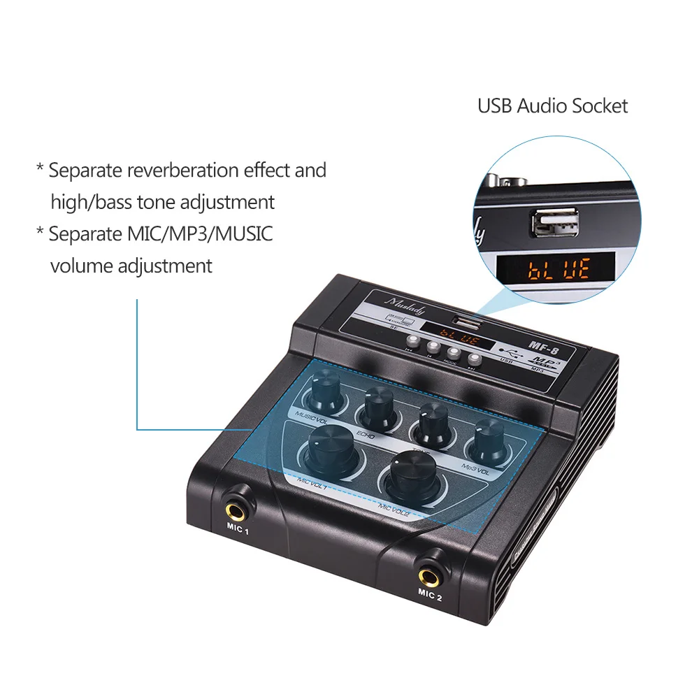 Звуковой миксер может управляться линейным аудио входом и может быть подключен к 2 комплектам микрофонов.
