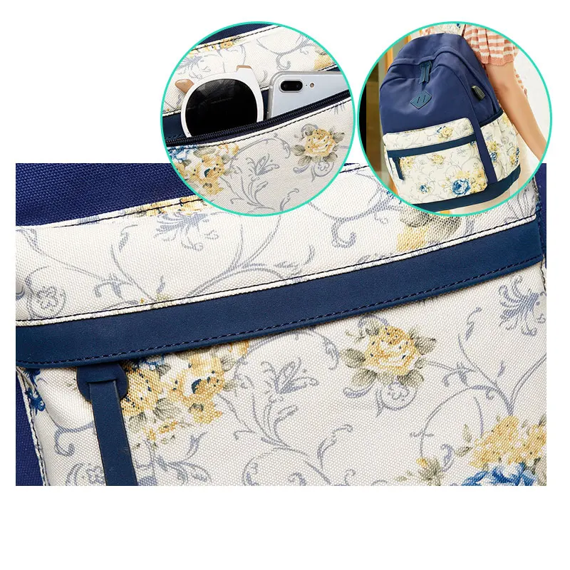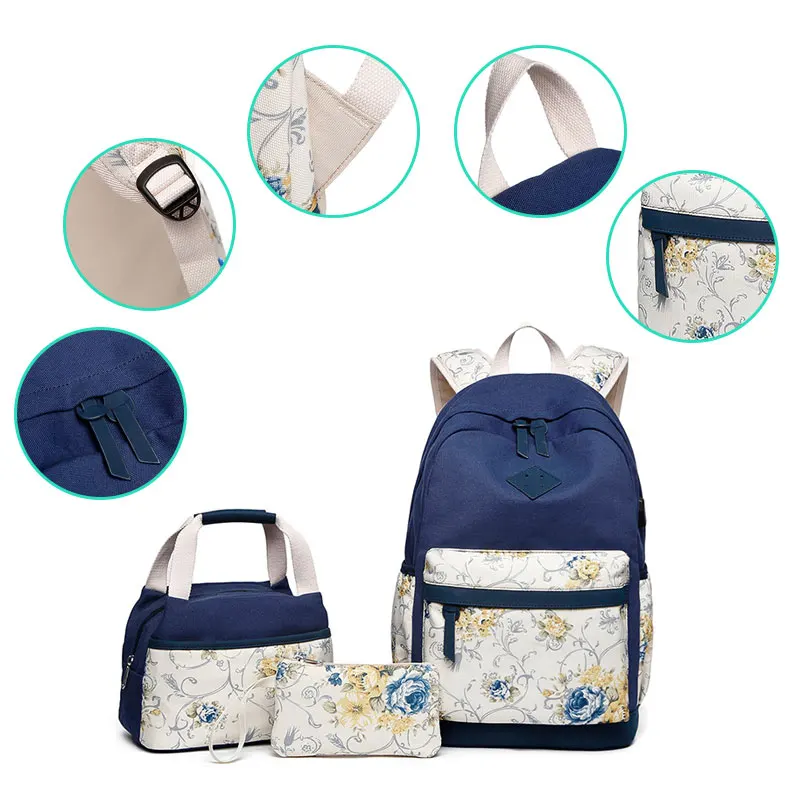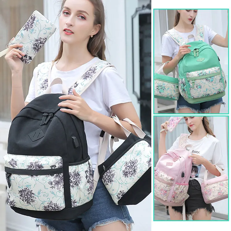 Брезентовые рюкзаки рюкзак для женщин-милая термо-сумка для ланча сумка с сумочкой для монет на запястье, 3 в 1 винтажный цветочный принт легкий USB