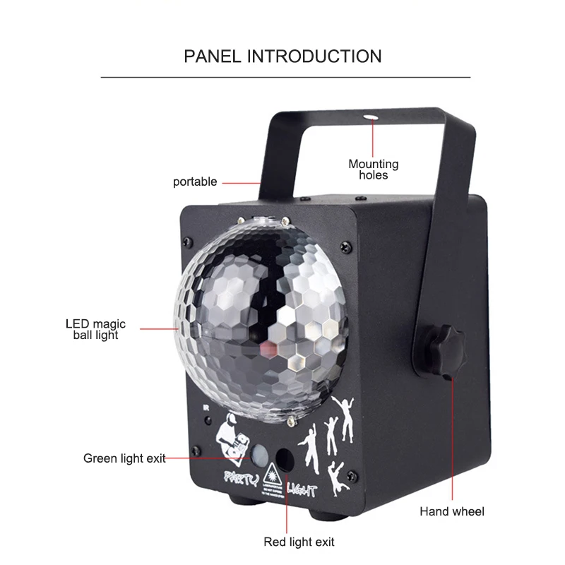 Версия диско-мяча для цвета RGB. 3 комбинации пучков (красный, зеленый, красный и зеленый) с красочным дискотечным шаровым светильник, такое сочетание с несколькими эффектами, чтобы создать более прекрасную атмосферу. Он может широко покрыть площадь 269кв. ft-323sq.ft на высоте 3 м после тестирования.