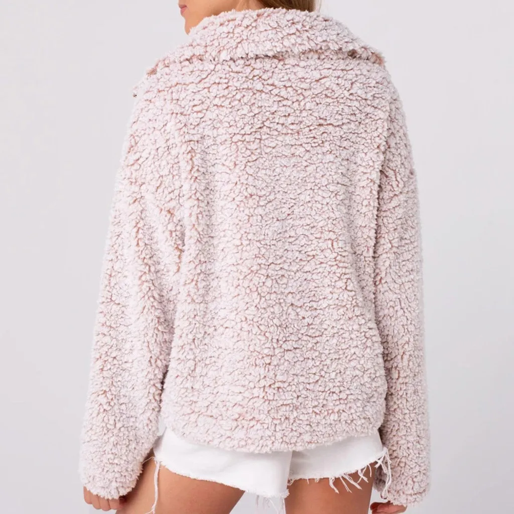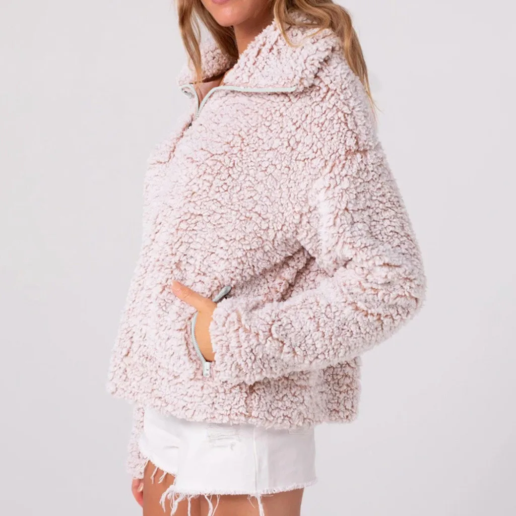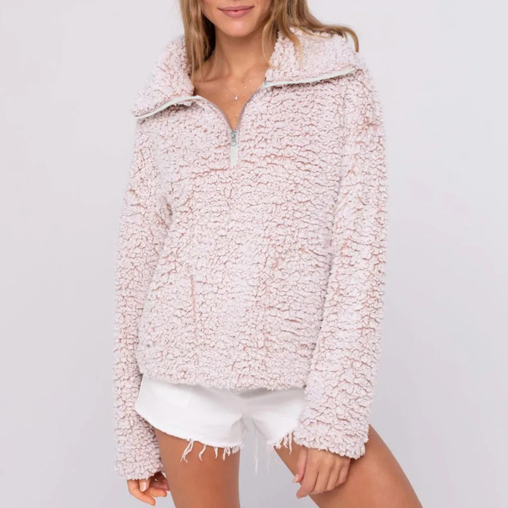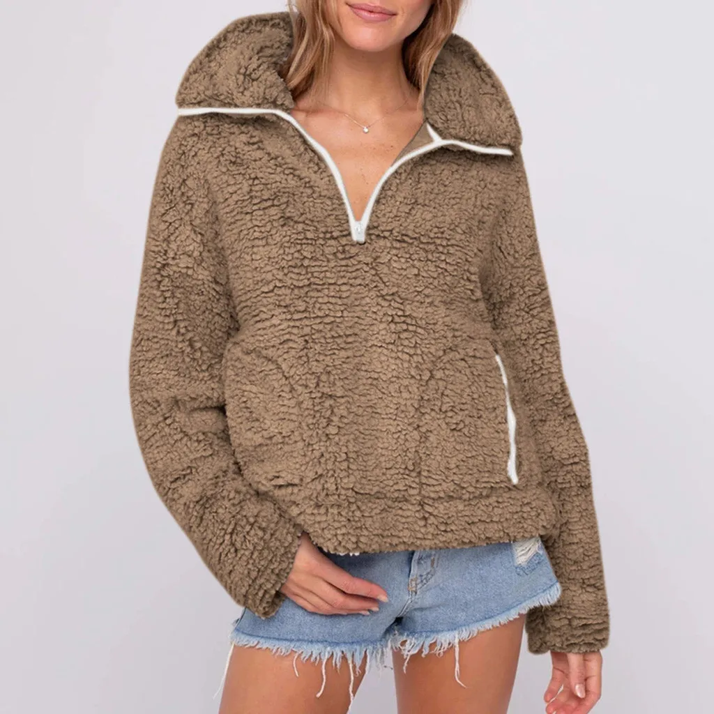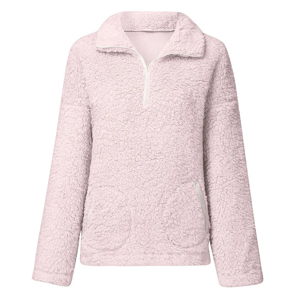 Женский однотонный пуловер из искусственного меха с отложным воротником на молнии и карманом