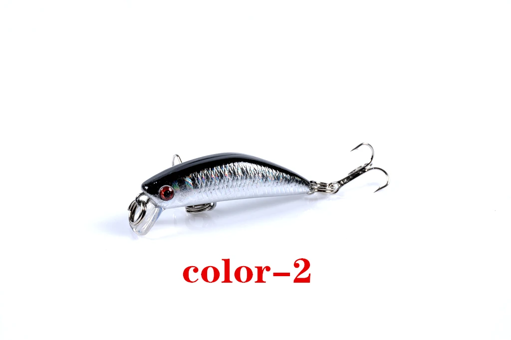 Цвет: 5 цветов Длина: 4,5 см Вес: 2,8 г Глубина погружения: 0,1 м -- 1,2 м Материал: Пластик Крючки: 10 # Глаза: 3 deда Вы получаете то, за что платите.