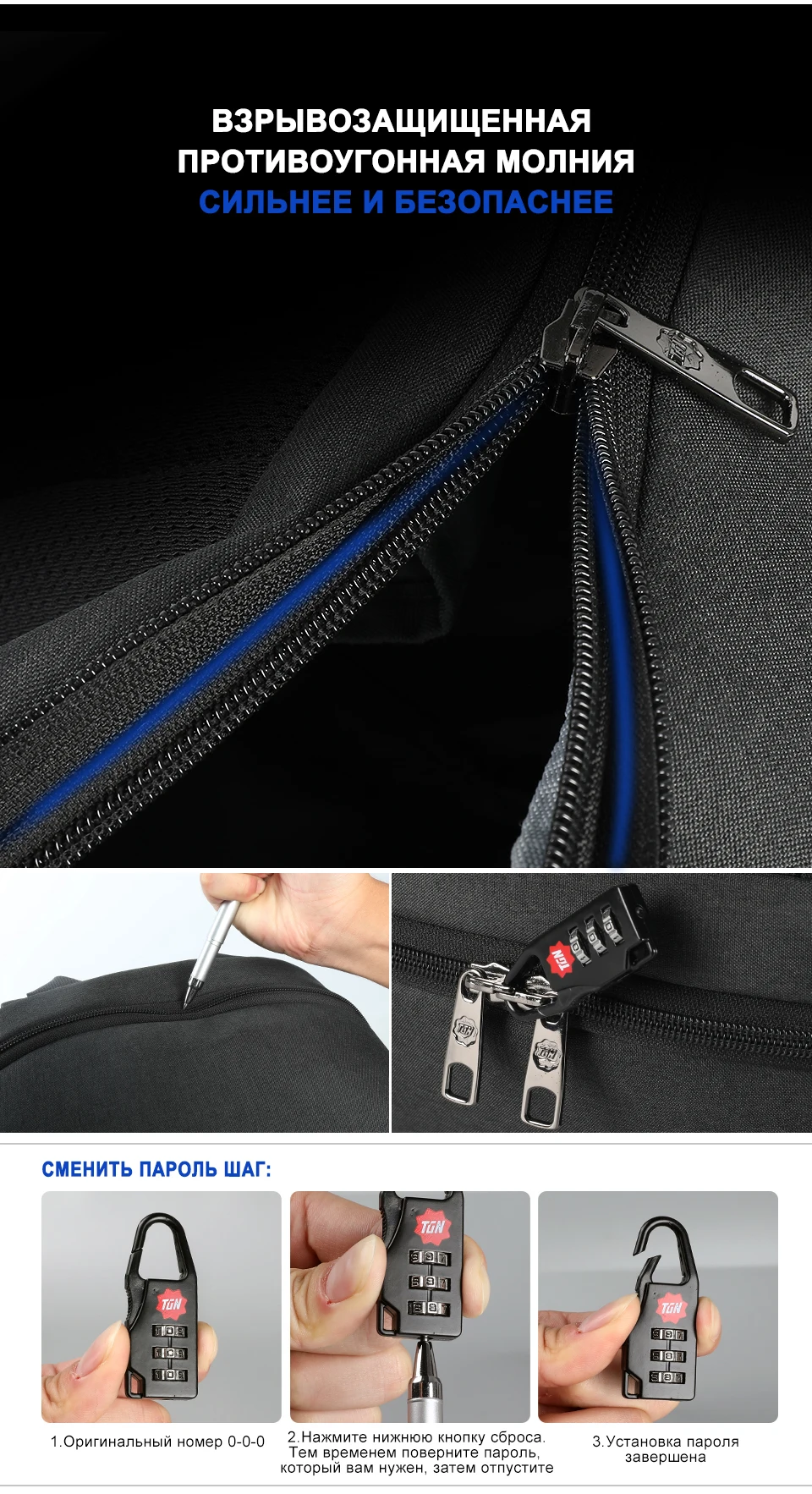 1. Отдельные брызг материал высокого качества 2. Покрытие с защитой от кражи двойные слои молния, защита от кражи RFID карман 3. Большая емкость и легкий вес 4. Внешний usb-порт для зарядки, только usb-порт, блок питания не входит в комплект 5. Багажный ремешок, держатель для очков, удобный карточный карман
