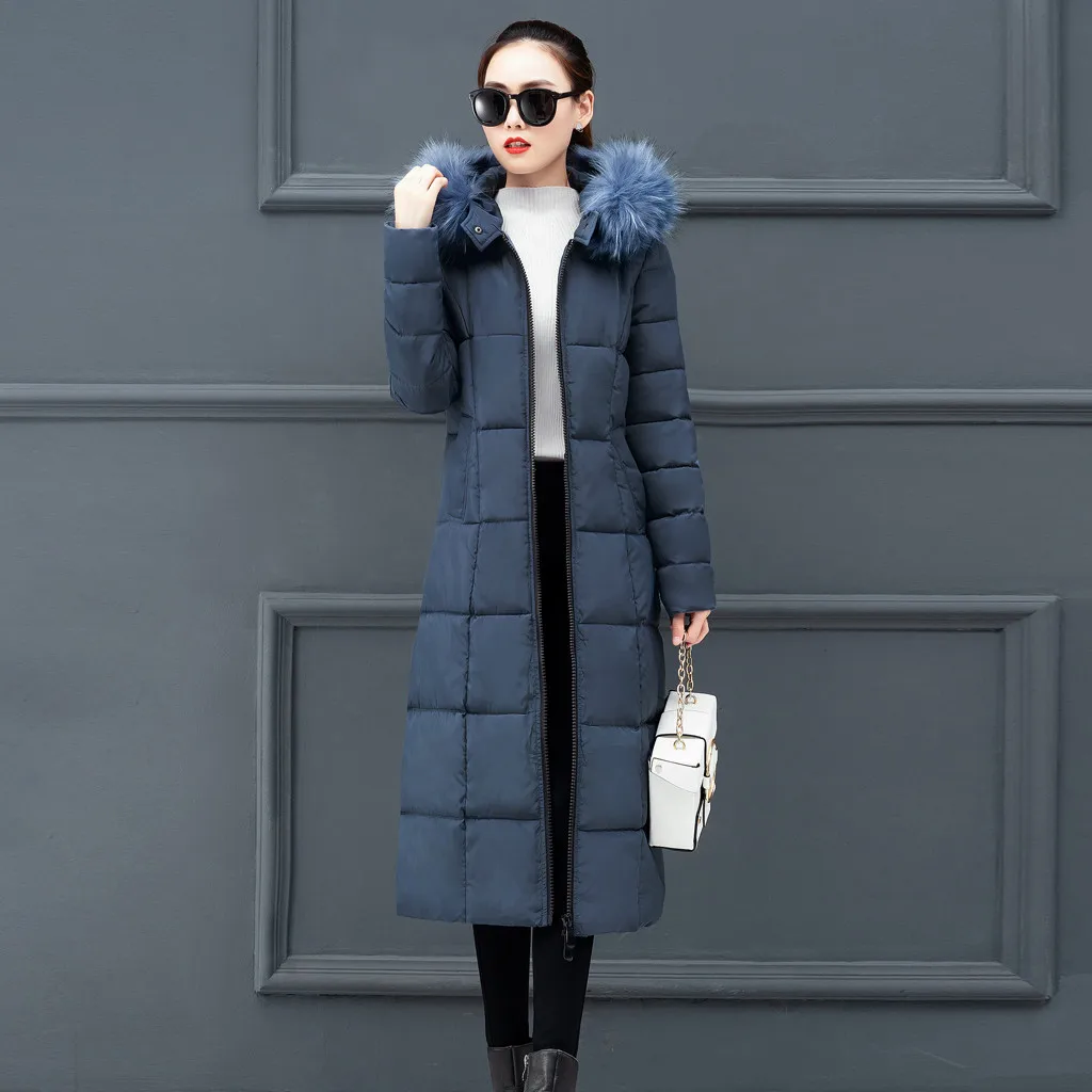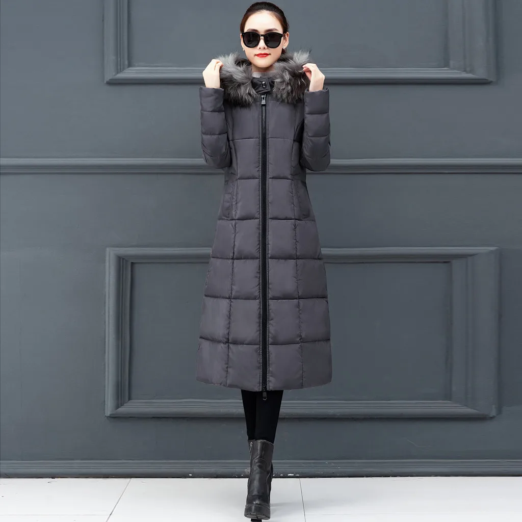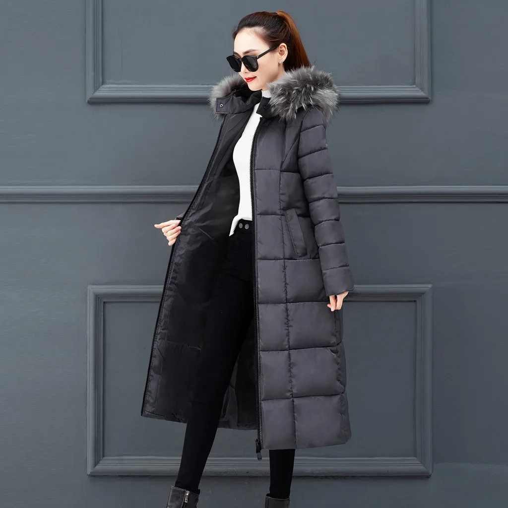 Женская верхняя одежда, пальто с меховым капюшоном, Длинные куртки на молнии с хлопковой подкладкой, пальто с карманами