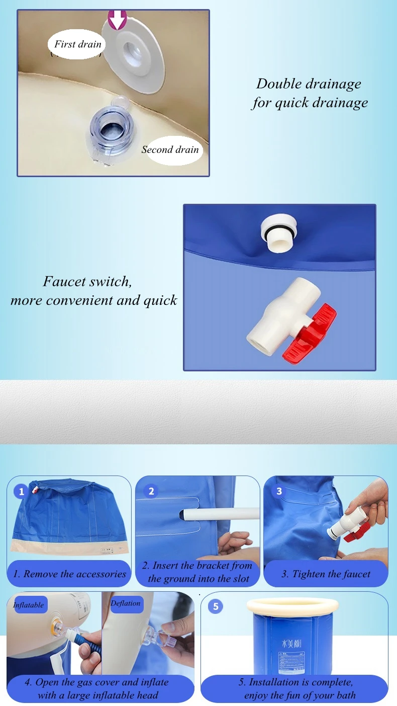 1. Низ жемчуга стеганый, против внешних помех, больше изоляции. 2. Таблица как одна, десять лет придерживается качества. 3. Используйте гибкий материал, складной дизайн. 4. Утолщенный морозостойкий внешний вид более утеплен и прочен. 5. Двухслойный дренаж, быстрый дренаж, переключатель крана, более удобный и быстрый. 6. Легко установить, складной, легко хранить, небольшой размер, можно использовать в различных сценах. * Заметки: Правильное использование: При заполнении воды, пожалуйста, не кладите трубу непосредственно на ванну на воздушный шар. Если вы не можете этого избежать, пожалуйста, Положите полотенце на воздушный шар, а затем поместите трубку для душа на полотенце, чтобы предотвратить прохождение трубки для душа. Высокое, поврежденное воздушное кольцо.