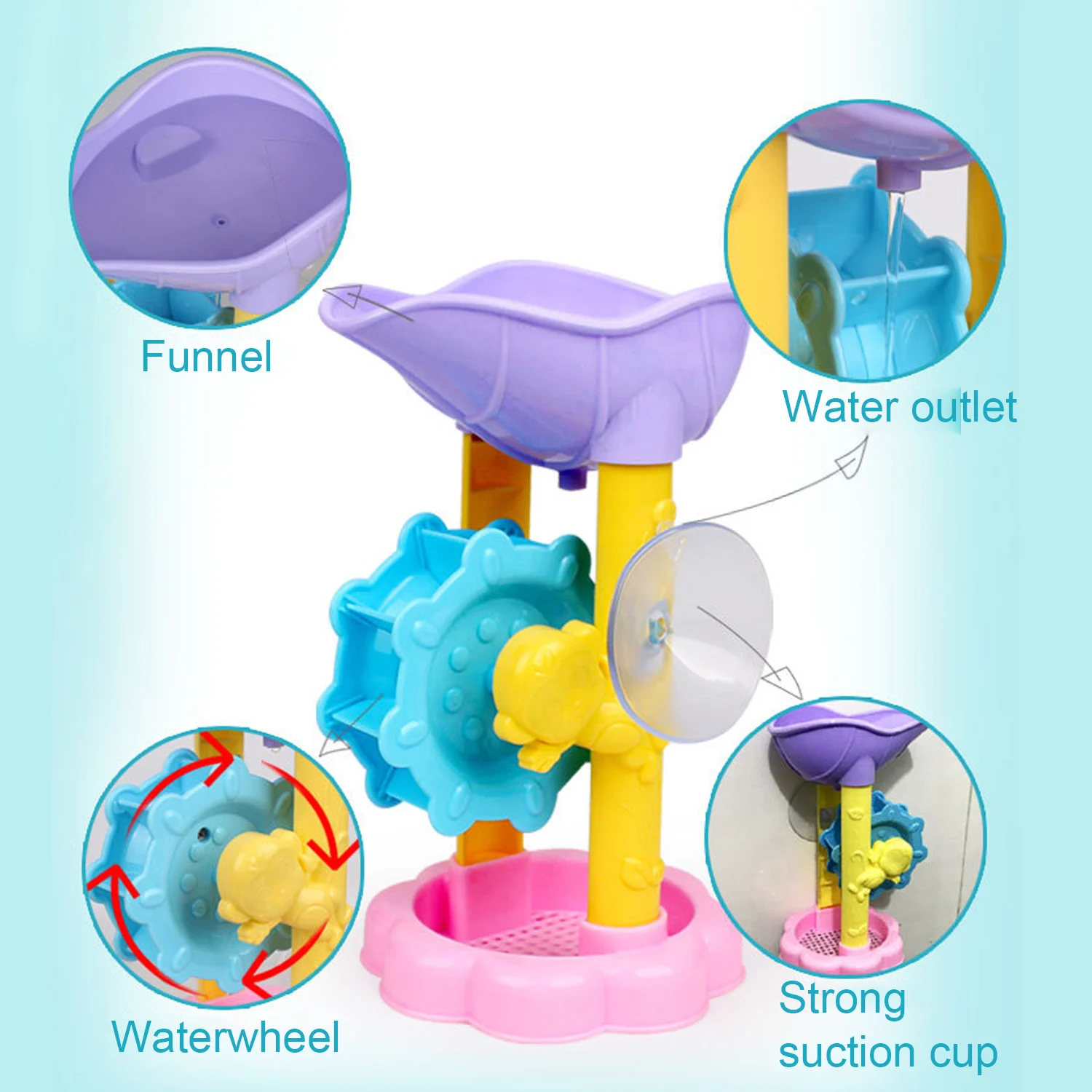 Когда вы налейте воду на водяное колесо с помощью прилагаемой лейки и ложки, колеса повернутся, заставит вашего ребенка смеяться и влюбиться в ванну.