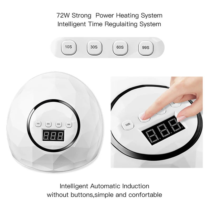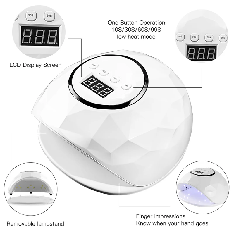 Этот продукт поможет вам высушить гели для ногтей. Он имеет кнопки 10 s, 30 s и 60 s, 99 s для настройки времени и низкотемпературный режим можно выбрать. Подсчитывание и хранение времени делает его удобным для наблюдения за временем сушки.