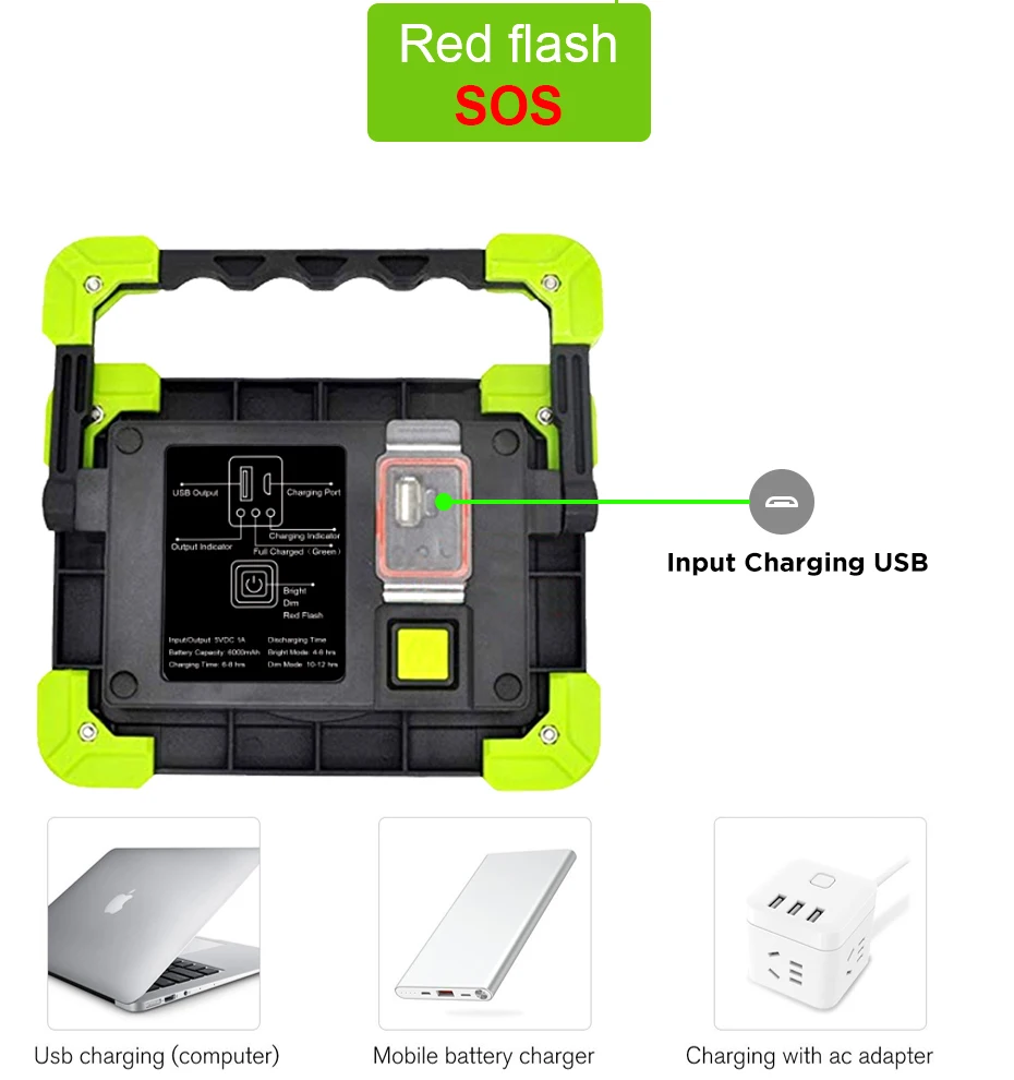 Встроенный литий-ионный аккумулятор емкостью 6000 мАч с функцией внешнего аккумулятора. Мощность: 20 Вт Световой поток: 1200LM Светодиодный: 1 COB + 32 светодиодный s Тип батареи: 3,7 V литий-ионный аккумулятор Емкость аккумулятора: 6000 мАч (3*2000 мАч) Светильник ing режим: Полная яркость, низкая яркость и красный светильник режим вспышки Время разрядки: 4-6 часов (полной яркости), 8-12 часов (низкой яркости) Входное и выходное напряжение/ток: 5 В постоянного тока, 1 А Материал: алюминий + абс + ПК Размеры: 6,81*5,20*1.77 дюймов/173*132*45 мм Вес: 18,66 унций/529 г