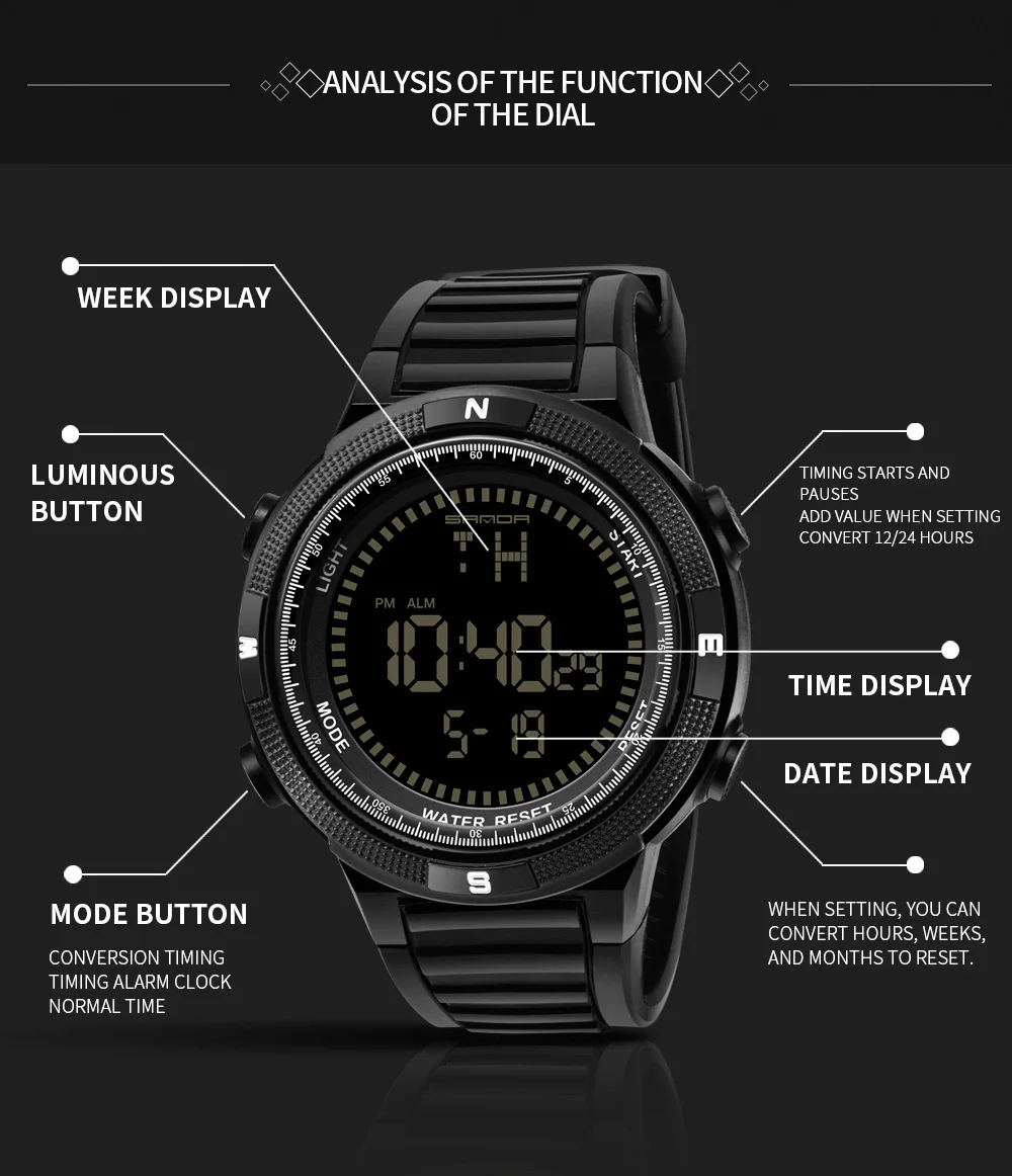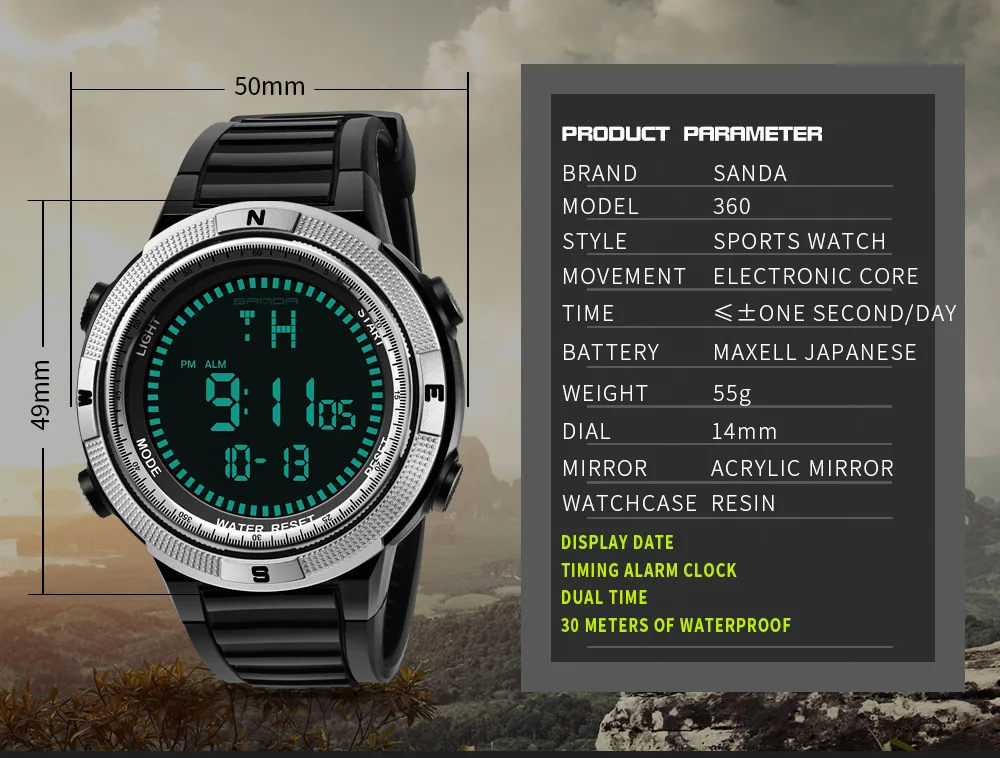 Функции: светящийся, отображение даты/Недели/месяца, будильник, календарь, хронограф, фаза Луны, водонепроницаемость, ударопрочность,