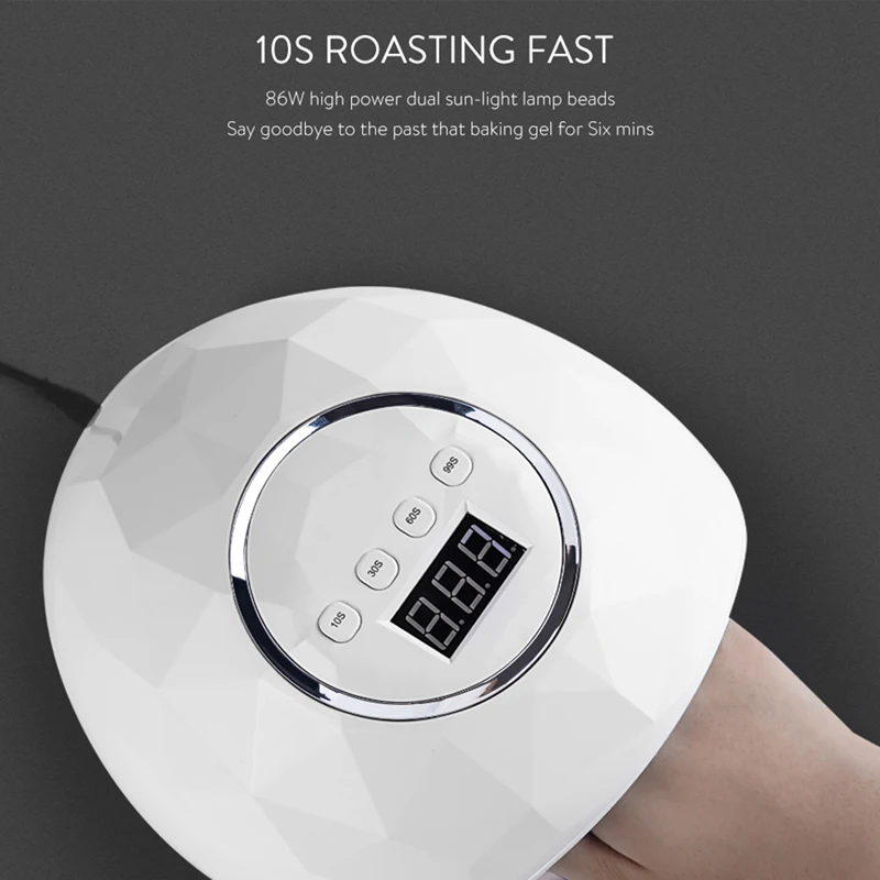 Этот продукт поможет вам высушить гели для ногтей. Он имеет кнопки 10s, 30s и 60s, 99s для установки времени и может быть выбран режим низкого нагрева. Отсчитывание и сохранение времени позволяет наблюдать за временем сушки.