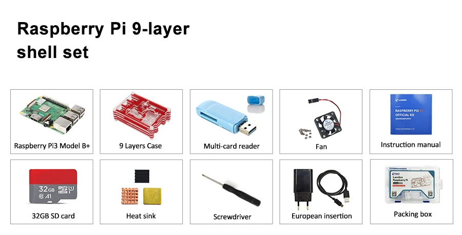 1,1. Raspberry Pi 3B + 2.Raspberry Pi 3B + 9-слой чехол с охлаждающим вентилятором 3.Raspberry Pi 3B + heat link 4. Адаптер питания Raspberry Pi EU 5,32G TF карта 6.Raspberry Pi USB Reader 7.Raspberry Pi 3B + инструкция по комплекту 8. Отвертка 9.Raspberry pi 3B + комплект внешнего корпуса