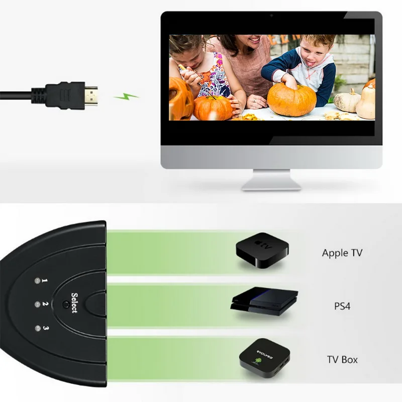 <3-портовый HDMI переключатель> этот коммутатор с 3 входными портами, поэтому вы можете подключить 3 устройства одновременно, что может уменьшить частоту отключения и повторного подключения.