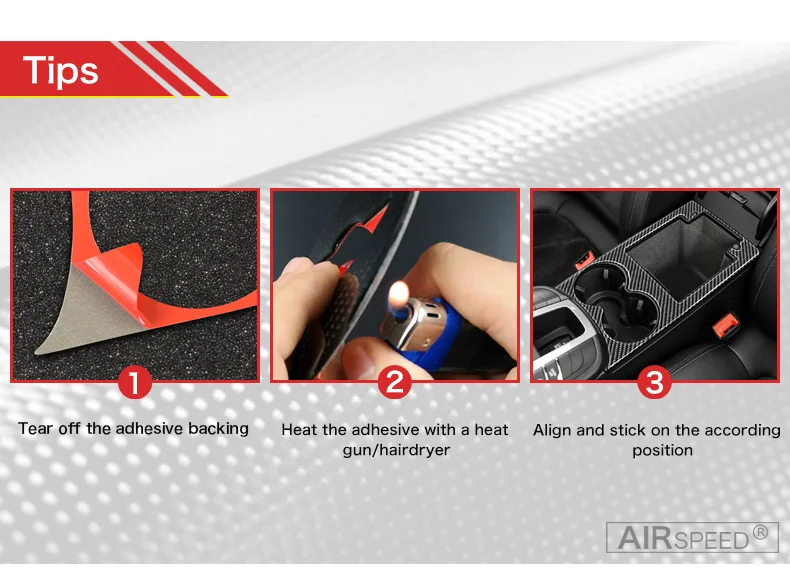 1. Очистите область и устраните любые загрязнения перед установкой этого элемента. 2. Поставить этот товар с мишень-позиции соответственно и удалите отклеивающуюся пластинку 3M лента подложка. 3. Нажмите на изделие равномерно после правильного выравнивания. 4. Избегайте любой ситуации, которая может намочить этот товар в течение 24 часов после установки. -Пожалуйста, обратитесь за помощью к профессионалам, если вы не уверены, как это сделать. -Пожалуйста, подогреть слой ленты 3м подложку Тепловая пушка для лучшего прилипателя эффект, когда температура окружающего воздуха ниже, чем 20 ℃.