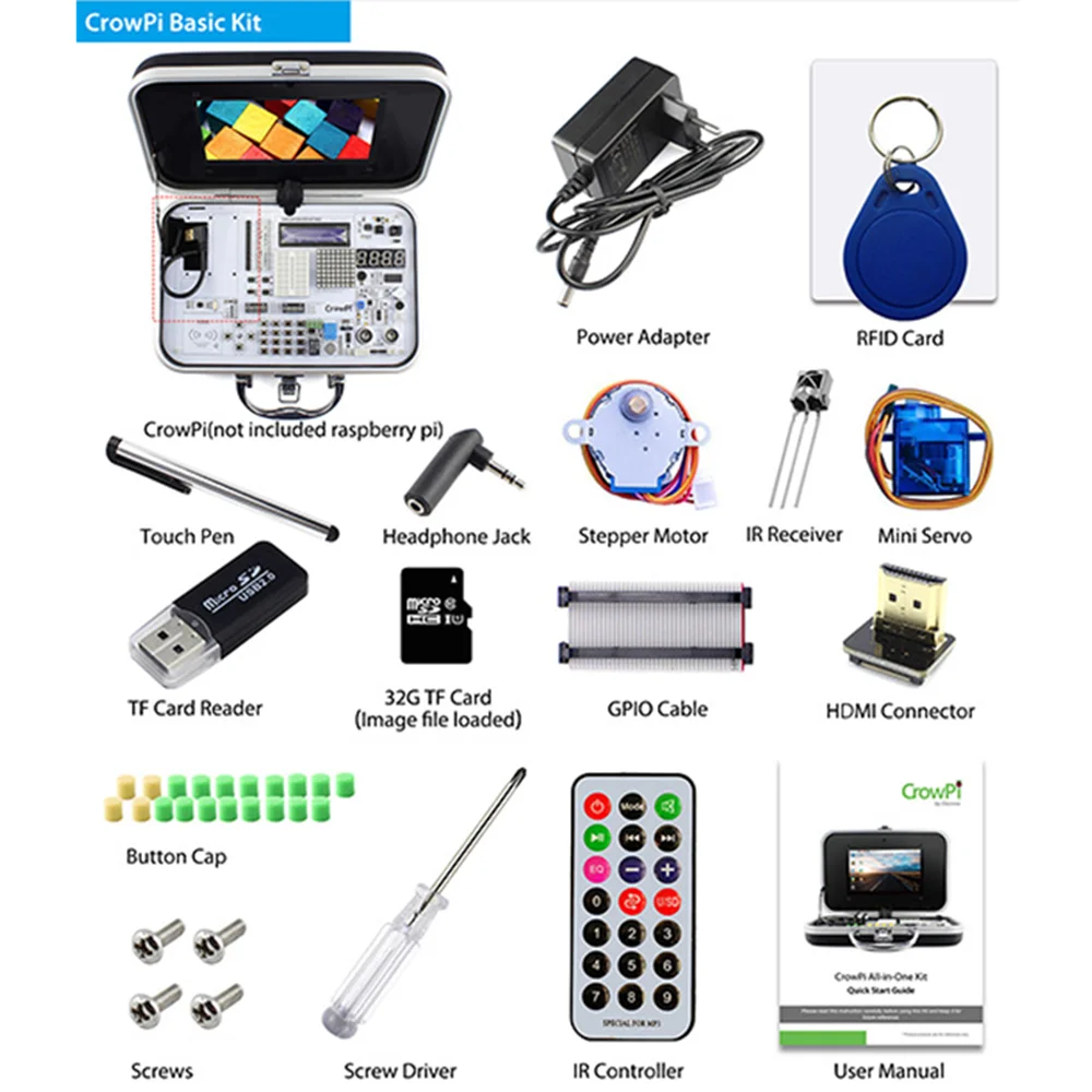 1 x CrowPi (в комплект не входит Raspberry Pi) 1 х адаптер питания 1 х 32G TF карта 1 х TF кард-ридер 1 х rfid-карта + бирка 1 х сенсорная ручка 1x5 V шаговый двигатель 1 х разъем для наушников 1 х разъем HDMI 1 х Отвертка 1 x GPIO кабель 1 х ИК-приемник 1 х 9g сервопривод 1 х инфракрасный пульт дистанционного управления 20 x Чехлы для клавиш 1 х сумка для винтов 1 х Руководство пользователя