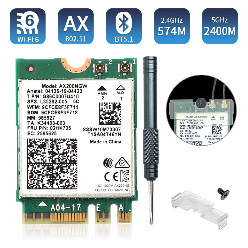 Chipest бренд: для Intel Модель: AX200NGW (официальная версия) Двухдиапазонный: 2,4 ГГц/5 ГГц (160 МГц) Скорость до 1730 Мбит/с (маршрутизатор должен быть на 160 МГц); Форм-фактор AX200 M.2 2230, поддерживающий максимальную скорость 2,4 Гбит/с на диапазоне 5 ГГц (160 МГц) И около 574 МБ/с./с использованием диапазона 2,4 ГГц (802.11ax в обоих). С поддержкой Bluetooth 5,1 MU-MIMO