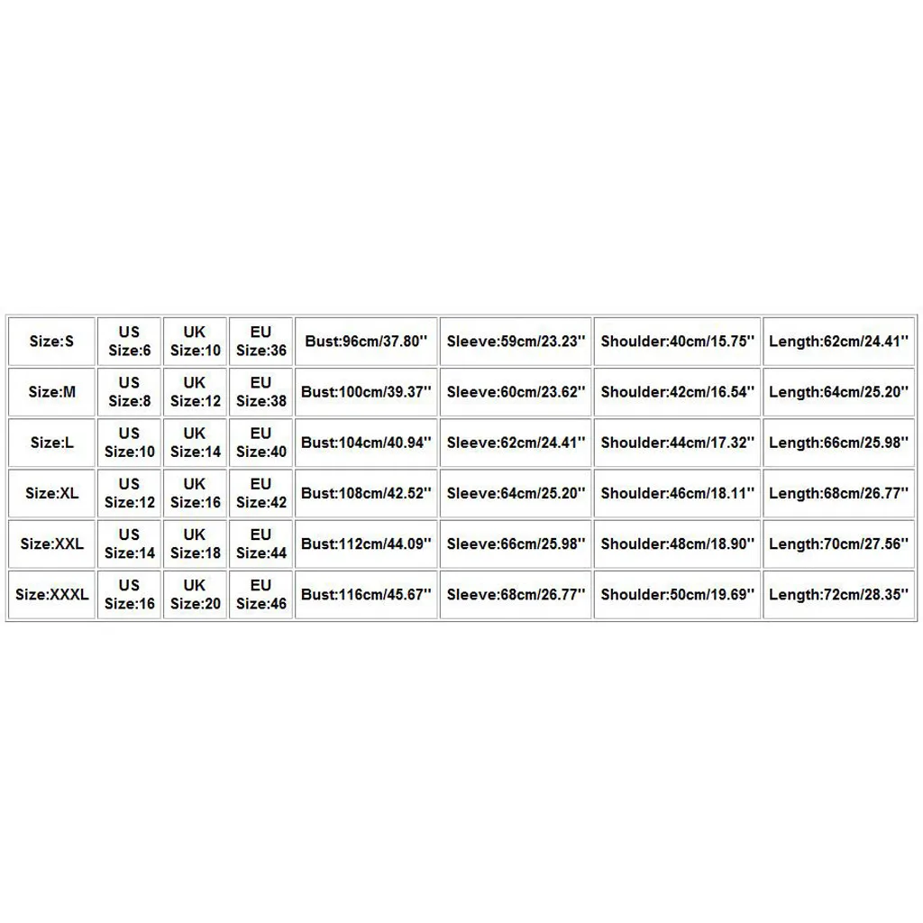 Размер: M Размер по американской системе: 8 Размер Великобритании: 12 Европейский размер: 38 Обхват груди: 100 см/39,37 дюйма Рукав: 60 см/23,62 дюйма Ширина плеч: 42 см/16,54 дюйма Длина: 64 см/25,20''