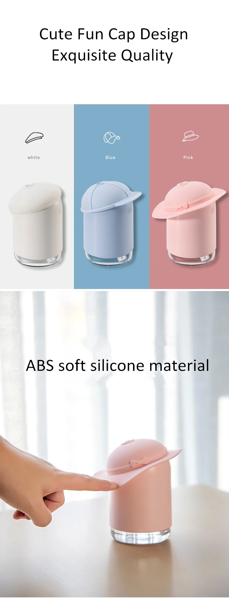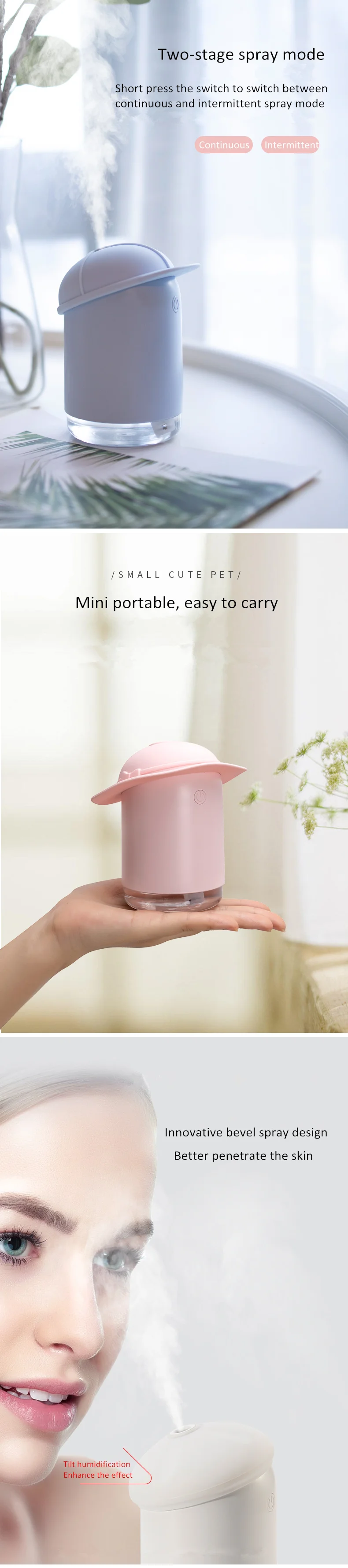 Название продукта: забавная Крышка увлажнитель Материал: ABS/PP/силикон Размер: синий 91,6*80,5*122,8 мм White81.7 * 81,3*121,3 мм Pink109.5 * 115,8*121,5 мм Цвет: розовый синий белый мощность: 1,5 Вт Входное напряжение: 5 В постоянного тока Рабочий ток: 300 мА крышка резервуара для воды Прозрачность: 200 мл Время использования: 4-8 ч Количество распыления: 40 мл/ч ночник: цветные яркие огни