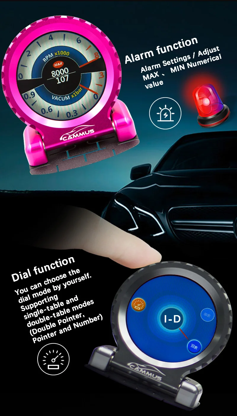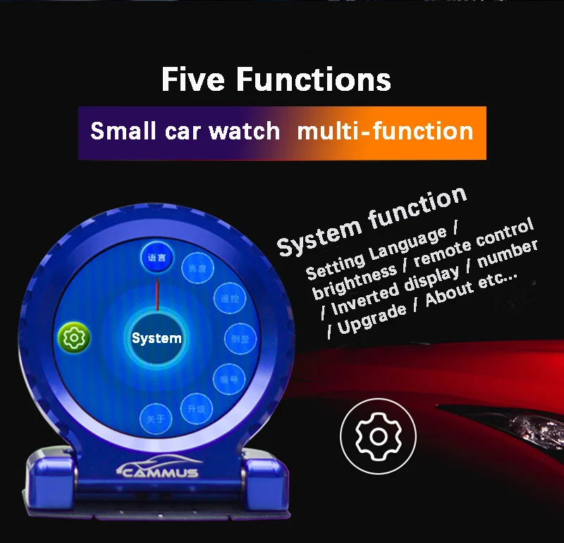 Доступно в общей сложности 6 цветов; Доступно 4 различных стиля интерфейса циферблата; Доступно 2 режима циферблата (одиночный датчик, двойной измерительный прибор); Дистанционное управление, поддержка китайского/английского языков.