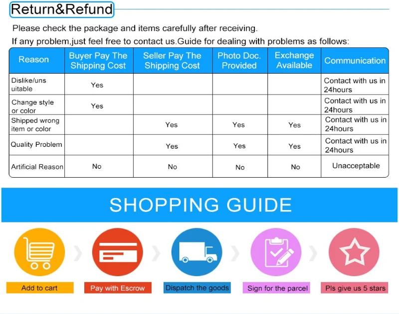 Письмо покупателю нашего магазина: 1. Пожалуйста, убедитесь, что ваш адрес и ваше полное имя правильно, чтобы получить товар вовремя; 2. Все товары будут отправлены в течение 2-7 дней после подтверждения оплаты заказа, чем быстрее Вы оплатите, тем больше вы получите товар. 3. Бесплатная онлайн-доставка включает только стоимость товара и бесплатную почту. Не включают налоги или таможенные сборы, которые могут быть собраны в стране клиента. Мы сделаем все возможное, чтобы помочь вам получить товар, но мы не несем ответственности за это. 4. Если у вас есть какие-либо вопросы с нашими товарами или услугами, не стесняйтесь связаться с нами, спасибо! Экспедиция 1. Мы в основном поставляем авиапочту Китая для способа доставки и более подходящего выбора почтой. 2. Все расходы на импорт оплачивает покупатель. Мы не несем никакой ответственности. 3. Пожалуйста, проверьте стоимость доставки и обработки перед покупкой. Пожалуйста, убедитесь, что ваш адрес указан правильно. Мы не будем поддерживать потерянную, поврежденную или украденную почту. Пожалуйста, оплатите страховку, чтобы избежать этих ситуаций. По субботам, воскресеньям и праздникам доставка не доступна. Послепродажное обслуживание 1. Когда вы получили посылка, пожалуйста, откройте ее и проверьте ее перед подписанием. Не подписывайте, если товар поврежден, и попросите компанию доставки сделать «сертификат повреждения». В противном случае мы не предоставляем никаких гарантий и возврата средств, спасибо за понимание! 2. Дорогие друзья, если у вас есть какие-либо вопросы или комментарии о наших продуктах или политике, пожалуйста, свяжитесь с нами, заказав сообщение или оставьте нам адрес электронной почты. Мы ответим в течение 24 часов. Комментарии 1. Ваше удовлетворение и ваши положительные комментарии очень важны для нас, пожалуйста, оставьте нам хороший комментарий, если вы удовлетворены нашими товарами и услугами. 2. Удовлетворение потребностей клиентов-это наиболее важные отзывы для нас. Если у вас есть вопросы, позвольте нам помочь решить их. Мы понимаем ваше чувство и сделаем все возможное, чтобы решить вашу проблему. 3. Мы стремимся обеспечить высокий уровень обслуживания клиентов. Мы высоко ценим Ваш 5-звездочный обзор и, пожалуйста, не оставляйте отрицательные комментарии, не спрашивая о помощи.