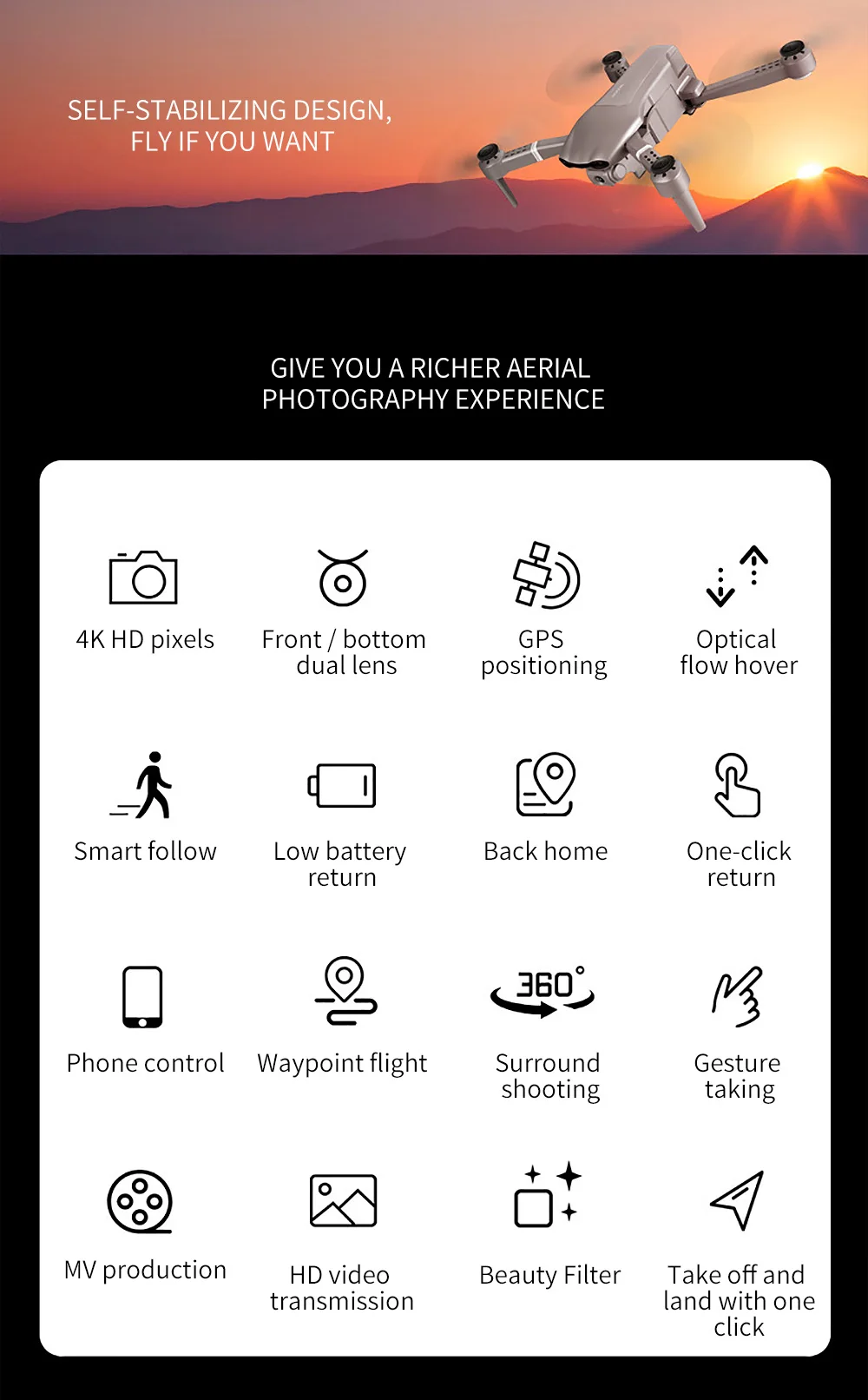 особенности продукта Модель: F3 Частота: 2.4G / 5G Канал: 4 канала Ось G: 6 ось Аккумулятор: 7,4 В 1800 мАч Литий-ионный аккумулятор (в комплекте) Батарея передатчика: 3 батарейки по 1,5 ААА (не включены) Время полета: 23-25 минут Время зарядки: 120-180 минут Расстояние дистанционного управления: 300-500м Полетный вес: около 240 г (включая батарею) Цвет: серебристый Камера дополнительно: 2.4GWIFI 1080P / 2.4G WiFi 4K HD / 5G WiFi 4K HD Поле зрения: широкий угол 120 ° 1080P пикселей: Картинка: 1920 * 1080 (экономия на мобильном телефоне) Видео: 1920 * 1080 (сохранить на телефоне) 4K пикселей: Изображение: 3840 * 2160 Видео: 3840 * 1080 APK: (Поддерживает IOS 6 или выше и Android 4.4 или high-end системы) Четырехсторонний размер: Размер продукта складывания (см): 18,5 * 12,5 * 6 см Размер разработки продукта (см): 33 * 33 * 6 см особенность: -С складными руками, он компактен и легко носить с собой. -GPS режим позиционирования может обеспечить более точный полет. -С 5G / 2.4G Wi-Fi функция, может быть подключен к приложению, система APK, чтобы делать снимки / видео, передавать изображения в режиме реального времени через камеру мобильного телефона -5G Wi-Fi fpv расстояние может достигать 300м. -Опциональная 2.4G WiFi 1080P /2.4G WiFi 4K HD / 5G WiFi 4K HD камера может предоставлять различные изображения и видео высокой четкости. -Поддержите меня: самолет будет жестко контролировать телефон и следить за направлением движения оператора. -С функцией удержания высоты, он может обеспечить стабильный полет. -Орбитальное движение заставит самолет лететь кругами, обеспечивая более холодный угол стрельбы. -Waypoint режим полета, просто нарисуйте маршрут на экране и используйте вертолет в качестве заданного пути. -С функцией автоматического возврата. Когда самолет потеряет сигнал контроллера, он вернется к точке взлета в соответствии с траекторией GPS. -Используя аккумулятор 7,4 В 1800 мАч, время полета составляет до 25 минут. -Неуправляемый режим, нет необходимости регулировать положение самолета перед полетом. - Функция возврата одним щелчком мыши, вы можете легко найти дорогу домой. -Один щелчок взлета / посадки. Взлет или посадка одной кнопкой автоматически, дрон взлетит или вернется в положение взлета. -С низкой защитой от перегрузки по току. -Антерференция использует технологию 2,4 ГГц. -4 канала, вы можете летать вверх, вниз, вперед, назад, влево, вправо. - Шестиосевой гироскоп для более стабильного полета и более легкого управления. -Он имеет 3 уровня переключения скорости полета, чтобы сделать полет более увлекательным. - Фюзеляж квадротора изготовлен из высокопрочного, высокопрочного инженерного пластика, который легок и долговечен. Функции: вверх / вниз, вперед / назад, влево / вправо, боковой полет, скорость полета 3-го уровня, светодиодная подсветка, определение местоположения по GPS, слежение за мной, полет вокруг, полет по маршрутной точке, режим удержания высоты, режим без головы, возврат в одну кнопку, один кнопка взлета / посадки, WiFi FPV, камера / видео В комплект поставки входят: 1 х F3 Quadcopter 1 пульт дистанционного управления 1 х 7,4 В 1800 мАч литиевая батарея (вы можете выбрать количество батарей при заказе) 1 х USB кабель для зарядки 1 отвертка 1 х руководство пользователя 2 запасных лезвия