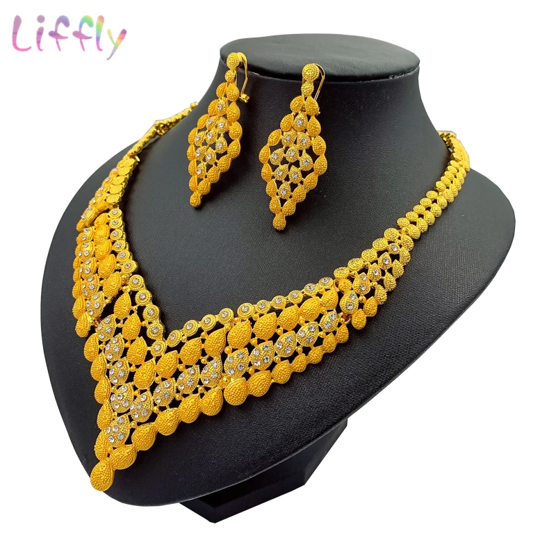 Роскошные Ювелирные наборы для свадебной вечеринки с кристаллами золотой комплект ювелирных изделий в дубайском стиле для женщин ожерелье серьги кольцо браслет Классические женские ювелирные изделия