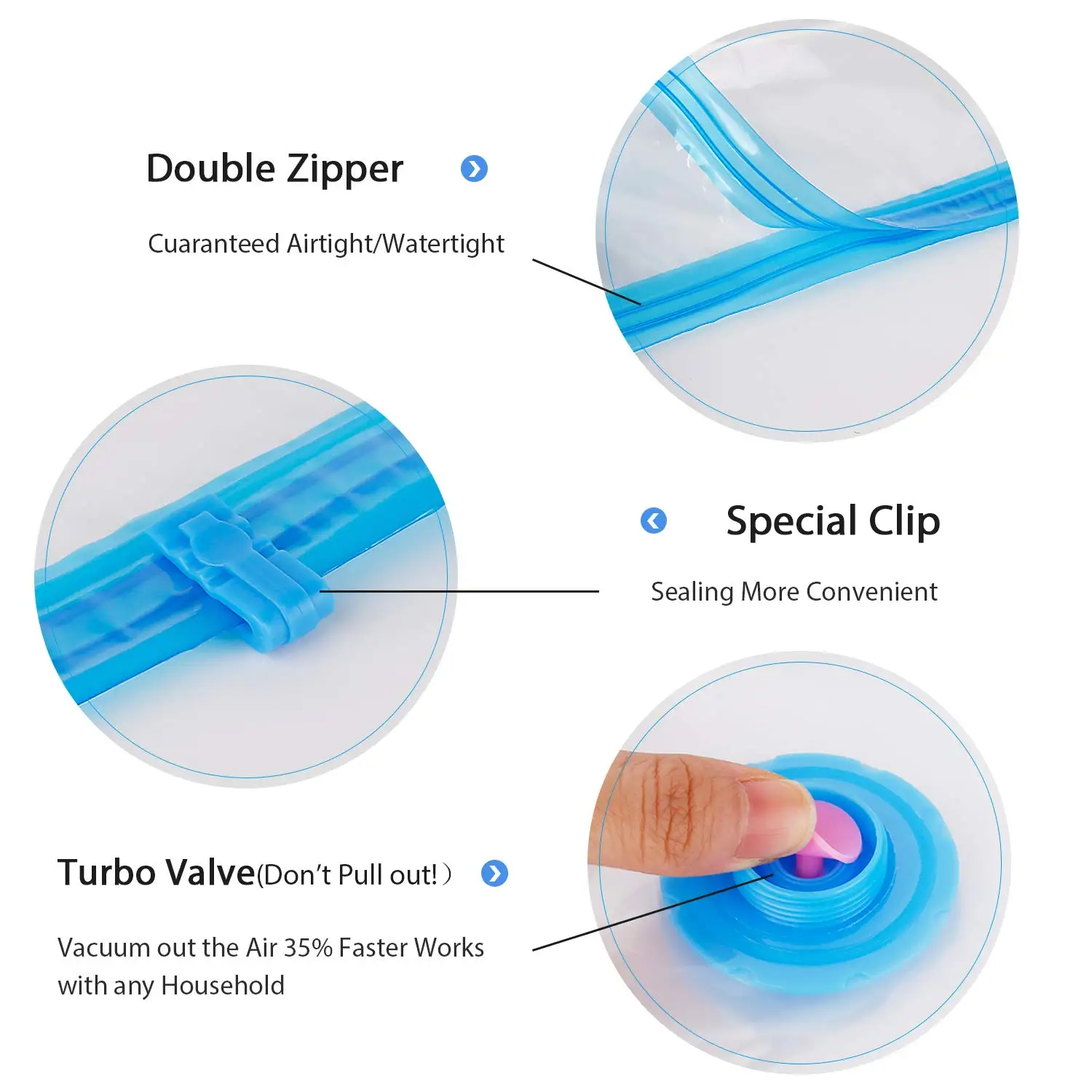 1. Высокое качество толстых PA и PE материалов, не легко сломать и может быть повторно использован. 2. Вакуумное сжатие одежды, Экономия до 75% пространства для хранения. 3. Защищает одежду от воды, влаги, насекомых, моли, грязи, плесени и запаха. 4. Простота в использовании, простота в эксплуатации, удобство и практичность. 5. Уникальная Двойная застежка-молния и обратный клапан для обеспечения отсутствия обратного потока воздуха.