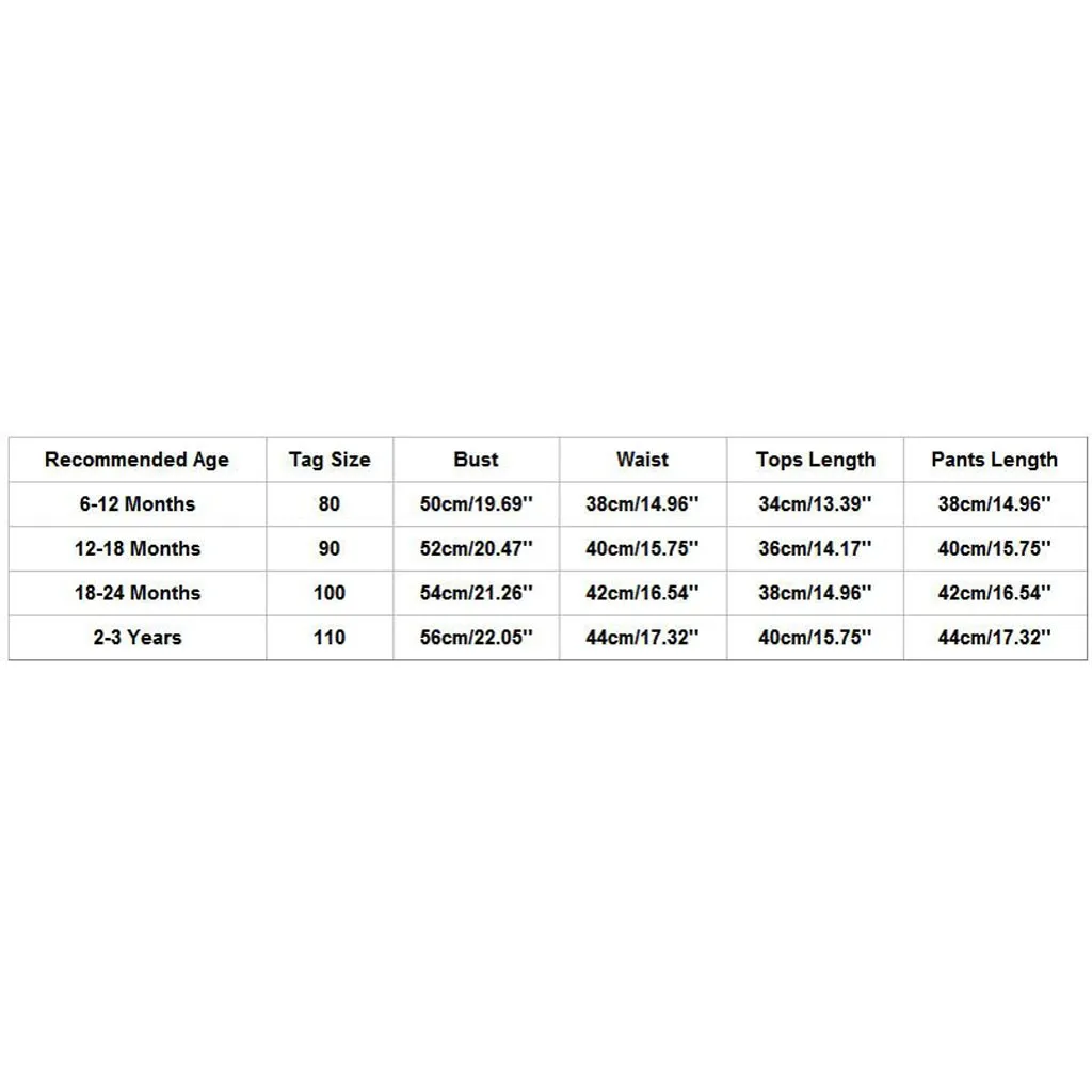 Recommended AgeTag SizeBustWaistTops LengthPants Length6-12 Months8050cm/19.69''38cm/14.96''34cm/13.39''38cm/14.96''12-18 Months9052cm/20.47''40cm/15.75''36cm/14.17''40cm/15.75''18-24 Months10054cm/21.26''42cm/16.54''38cm/14.96''42cm/16.54''2-3 Years11056cm/22.05''44cm/17.32''40cm/15.75''44cm/17.32''