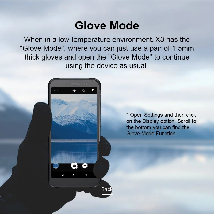 При низкой температуре окружающей среды. X3 имеет «режим перчаток», где вы можете просто Наденьте пару 1,5 мм толщиной Перчатки и откройте «Режим перчаток», чтобы продолжить использование устройства в обычном режиме. * Введите настройки, а затем нажмите на кнопку отображения. Прокрутите вниз, вы можете найти функцию режима перчаток.