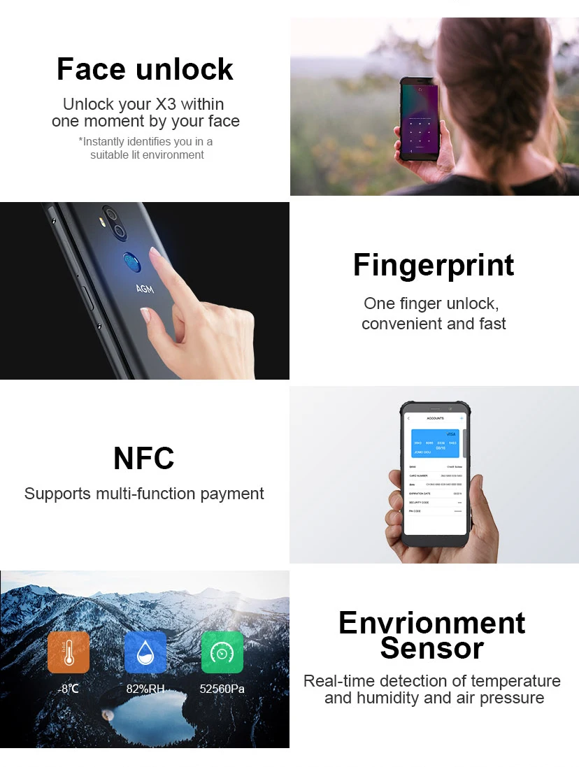 AGM X3 поддерживает технологию распознавания лиц, при которой фронтальная камера Мгновенно идентифицирует вас в подходящей освещенной среде, позволяя вам разблокировать телефон быстрее и проще, чем традиционные коды доступа или идентификатор отпечатка пальца