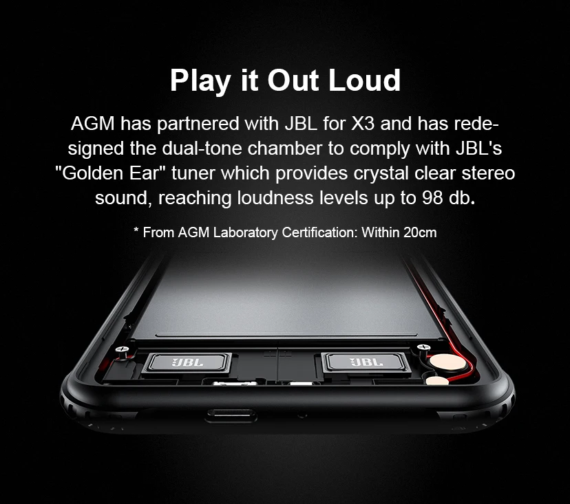 AGM сотрудничал с JBL for X3 и изменил дизайн двухтоновой камеры, чтобы соответствовать тюнеру JBL «Golden Ear», который обеспечивает кристально чистый стереозвук, достигая уровня громкости до 98дБ. * От AGM лаборатории сертификации: в пределах 20 см