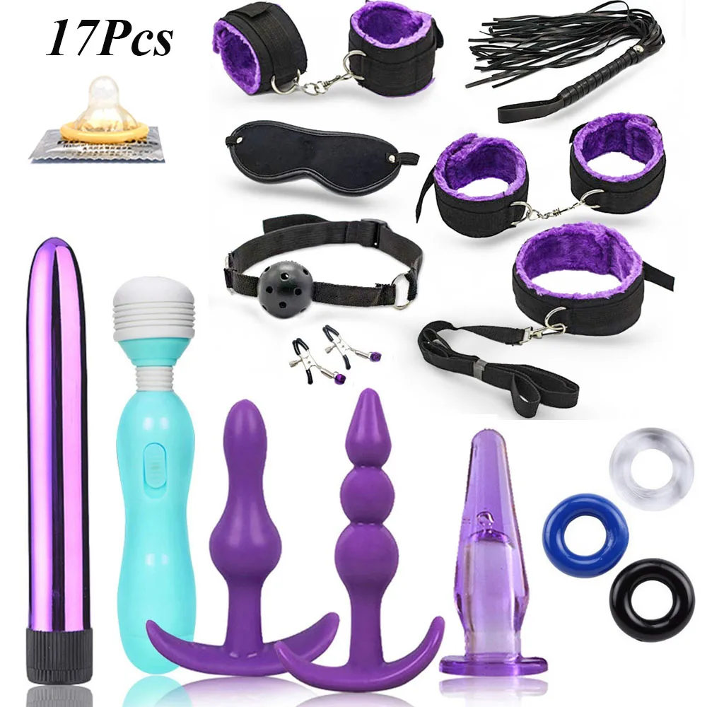 1 * игрушки для взрослых штекер (3 * LR44 батареи); 1 * вибрирующий рукав для пальца (2 * LR44 батареи); 1 * силиконовая Анальная пробка; 1 * силиконовая Анальная пробка с бусинами; 1 * Металлическая Анальная пробка; 2 * SM наручники; 1 * см воротник; 1 * глазами; 1 * рот кляп; 1 * кожаный хлыст; 2 * зажимы для сосков.