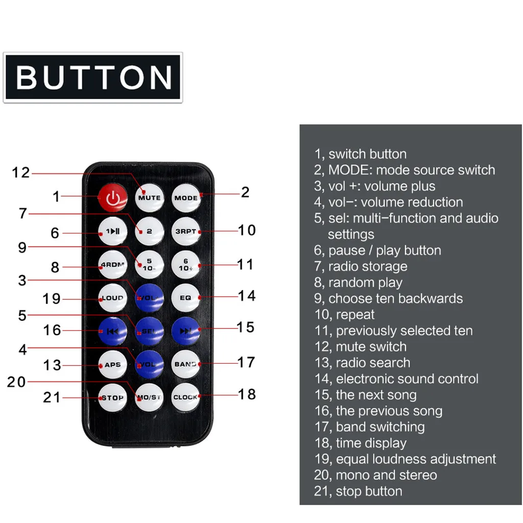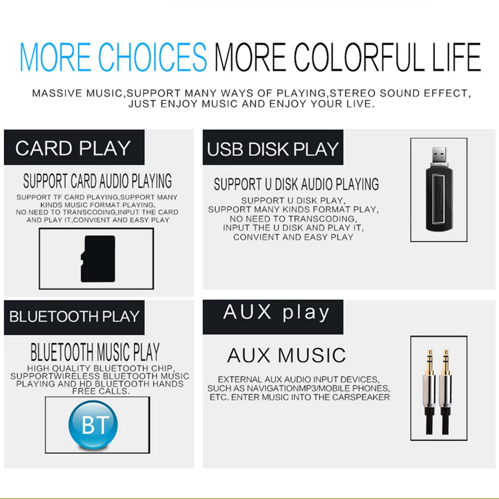 Поддерживает расширенные звуковоспроизводящие Профиль распределения Функция отображения времени выключения Радио (FM), чтение карты, чтение U-диск (аудио), функция AUX, функция BT. Передний aux аудио вход RCA аудио выход может быть Подключен к сабвуферу RCA терминал: 4 канала Аудио выход Цифровой высококачественный FM Стерео радио, 18 предустановленных станций (Частота: 87,5-108 МГц) Поддержка USB / SD / MMC Кард-ридер Поддержка аудио: MP3 Поддержка функция создания папок Поддержка точки останова и ID3 играть Регулятор громкости Rotar-y MP3 рандомизированный, 10 дорожек Воспроизведение вверх/вниз Электронное управление звуком Высокие частоты, басы, баланс и фейдер Бесшумный и громкий контроль 4-канальный выход Размер машины: 17,8 X 5X12.5 см Габаритные размеры: 18.8X5.8X12.5cm Напряжение: DC12VТехнические характеристики: