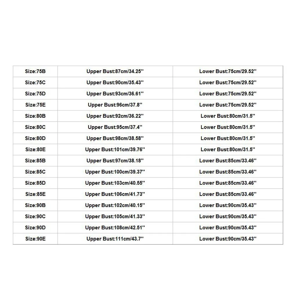 Размер Верхний бюст Ниже бюста 75B 87 см/34,25'' 75 см/29,52'' 75C 90 см/35,43'' 75 см/29,52'' 75D 93 см/36,61'' 75 см/29,52'' 75E 96 см/37,8'' 75 см/29,52'' 80B 92 см/36,22'' 80 см/31,5'' 80C 95 см/37,4'' 80 см/31,5'' 80D 98 см/38,58'' 80 см/31,5'' 80E 101 см/39,76'' 80 см/31,5'' 85B 97 см/38,18'' 85 см/33,46'' 85C 100 см/39,37'' 85 см/33,46'' 85D 103 см/40,55'' 85 см/33,46'' 85E 106 см/41,73'' 85 см/33,46'' 90B 102 см/40,15'' 90 см/35,43'' 90C 105 см/41,33'' 90 см/35,43'' 90D 108 см/42,51'' 90 см/35,43'' 90E 111 см/43,7'' 90 см/35,43''