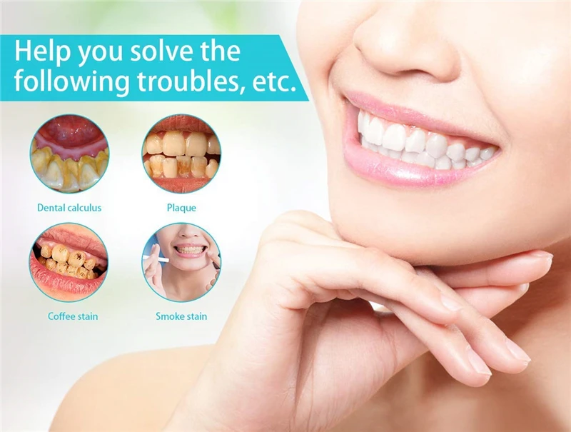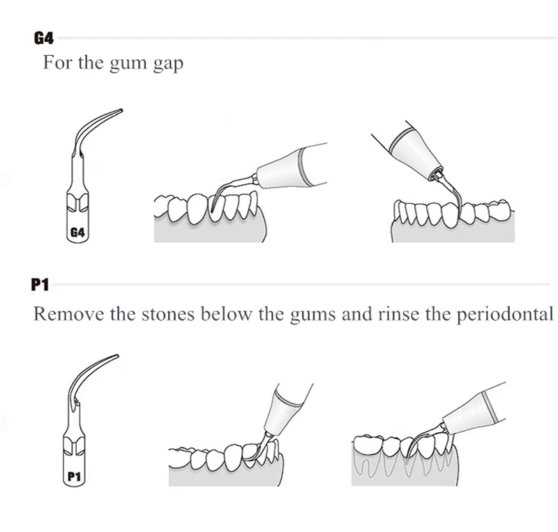 Примечание: Это ультразвуковое устройство. Вы почти не можете почувствовать вибрацию при обращении с ним. Но он начнет работать и получит звук при прикосновении к зубу. (Пожалуйста, плотно прикрутите наконечник при использовании, в противном случае это повлияет на работу.)