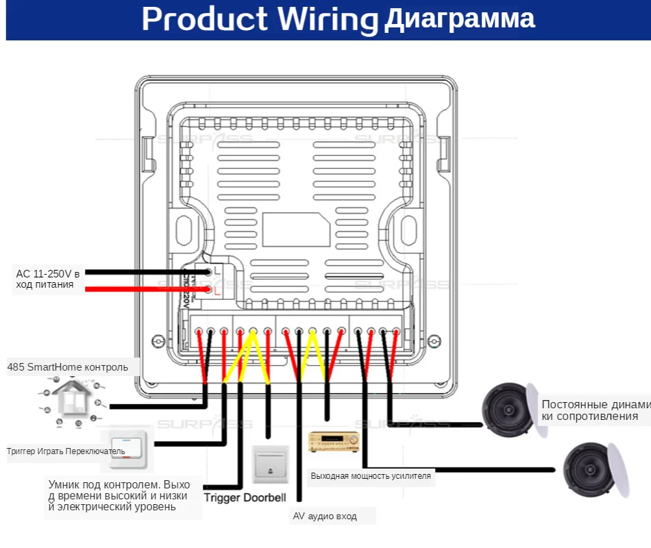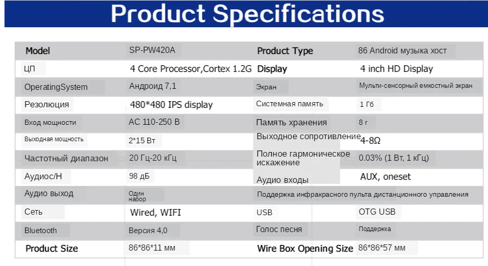 ● Полноэкранный сенсорный экран ● 4-дюймовый ips-дисплей, разрешение 480*480 ● Система Android 7,1, 4-ядерный процессор , Cortex 1,2G CPU ● Режим питания: AC 110-250VC ● Выходная мощность: 2*25 Вт (усилитель мощности) ● Выходное сопротивление: 4-8Ω ● Аудиовходы; выход ● Сеть: Поддержка WIFI ● Установка: 86 стандартная проволочная коробка, передняя стена ● Bluetooth: поддержка ● Частотная характеристика: 20 Гц-20 кГц ● Общее гармоническое искажение: 0.03% (1 Вт, 1 кГц) ● Аудио S/N: 96 дБ ● Размер продукта: 86*86*11 мм ● Размер отверстия проволочной коробки: 86*86*57 мм Цифровой стерео аудио в стене усилитель Описание функции: ● Управление мобильным приложением, голосовая связь, трансляция, приложение push-контент ● Поддержка голосового пробуждения, воспроизведения музыки, рассказов, детских песен, шуток, проверки погоды, проверки полетов, умного домашнего управления ● Воспроизведение Bluetooth, хост может управлять устройством воспроизведения Bluetooth для переключения музыки ● Поддержка функции пускового звонка ● Поддержка триггера связи для воспроизведения музыки ● Поддержка отключения триггера связи ● Поддержка синхронизации выходного уровня сигнала связи с другим оборудованием ● Поддержка внешнего оборудования для управления машиной через 485 ● Устройство переключения времени, само-набор загрузочных песен