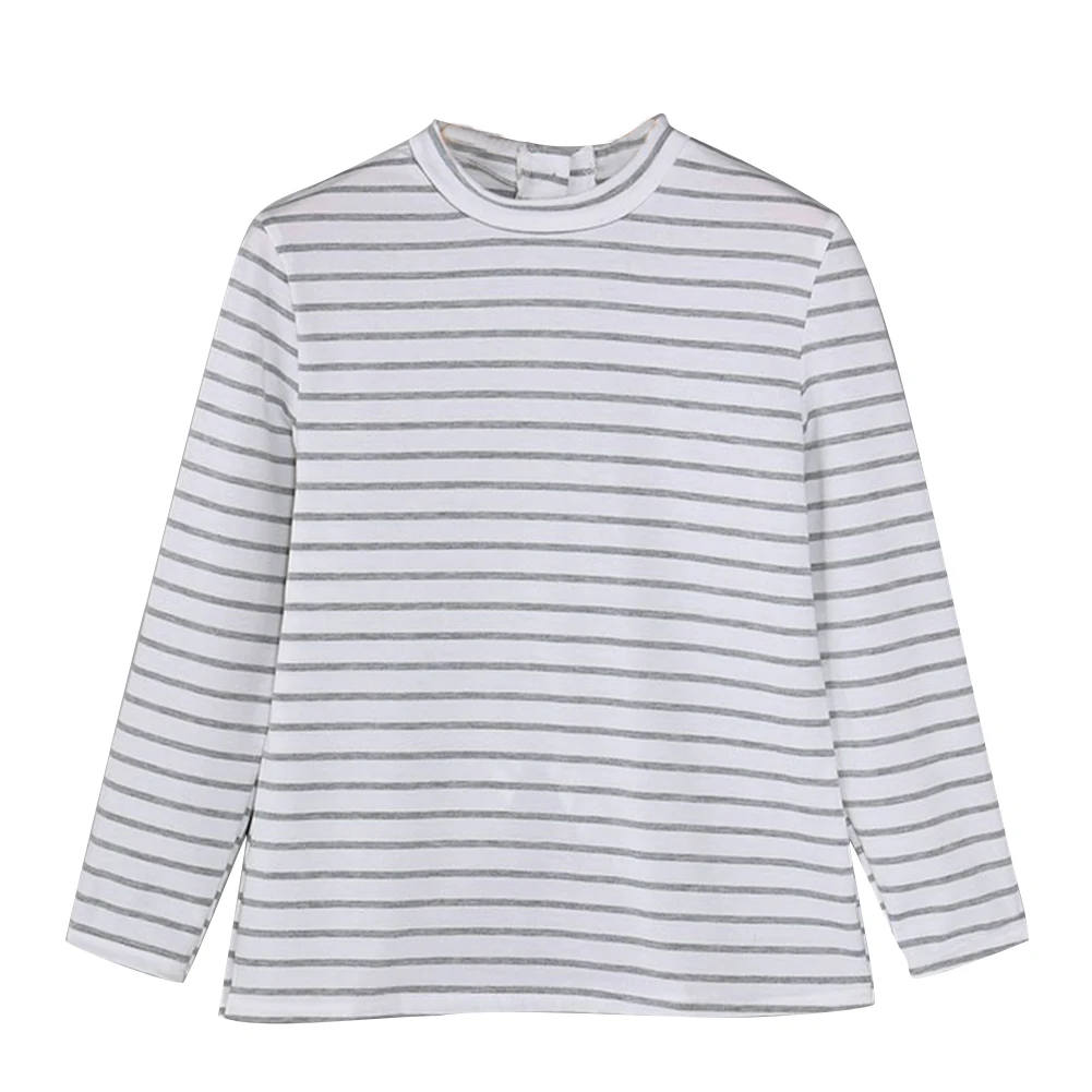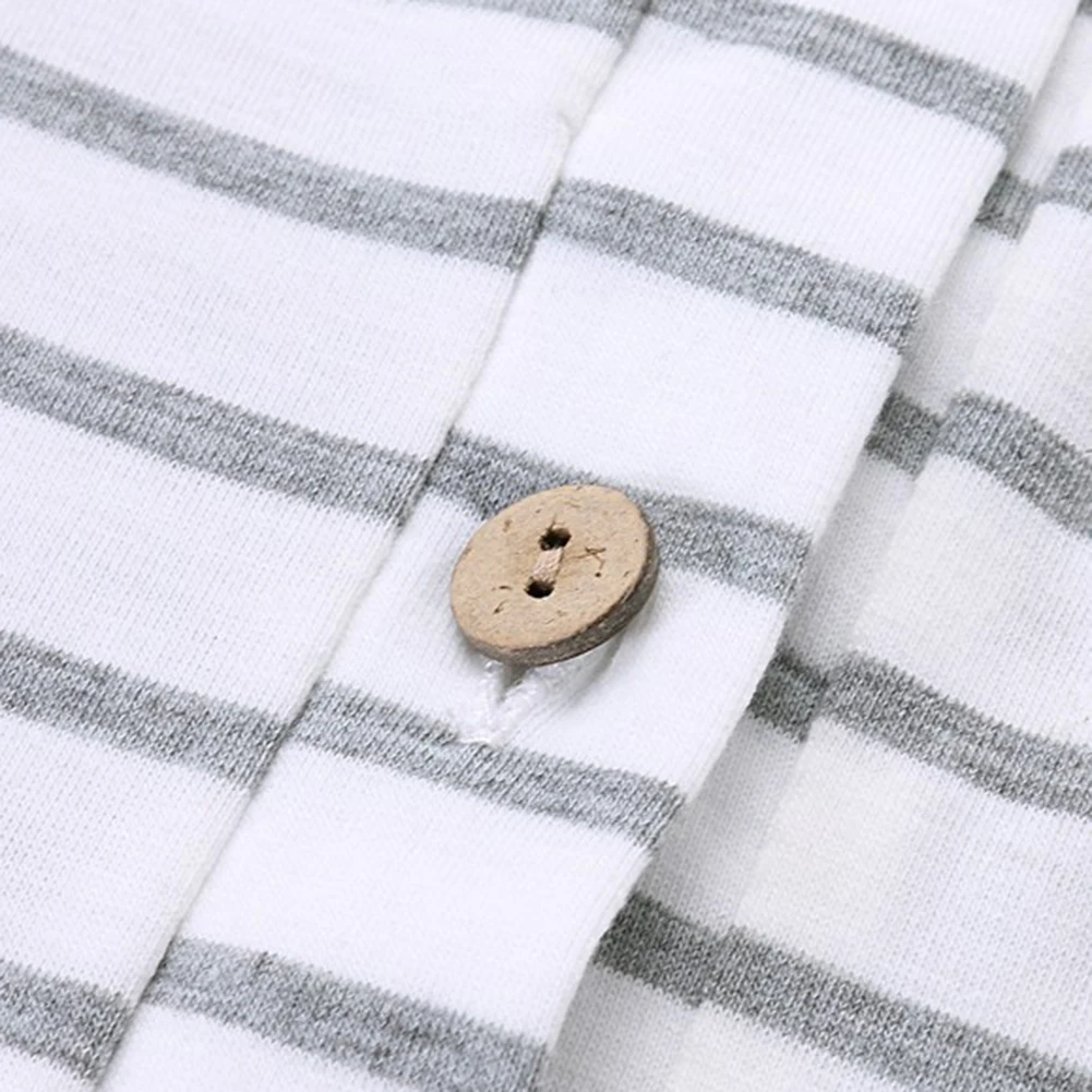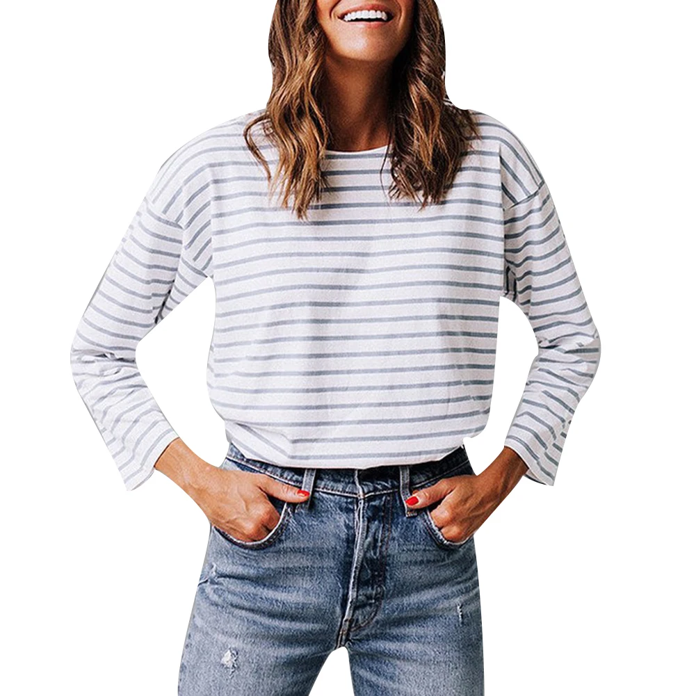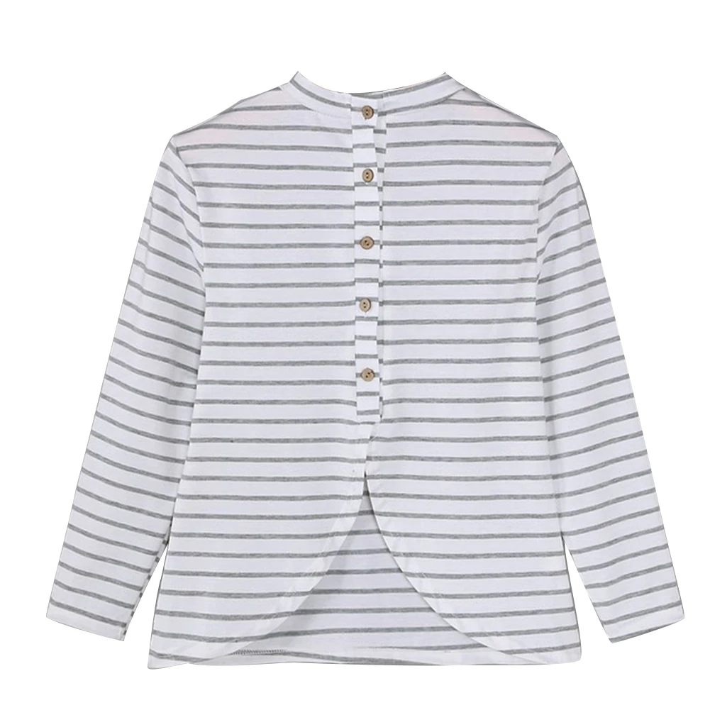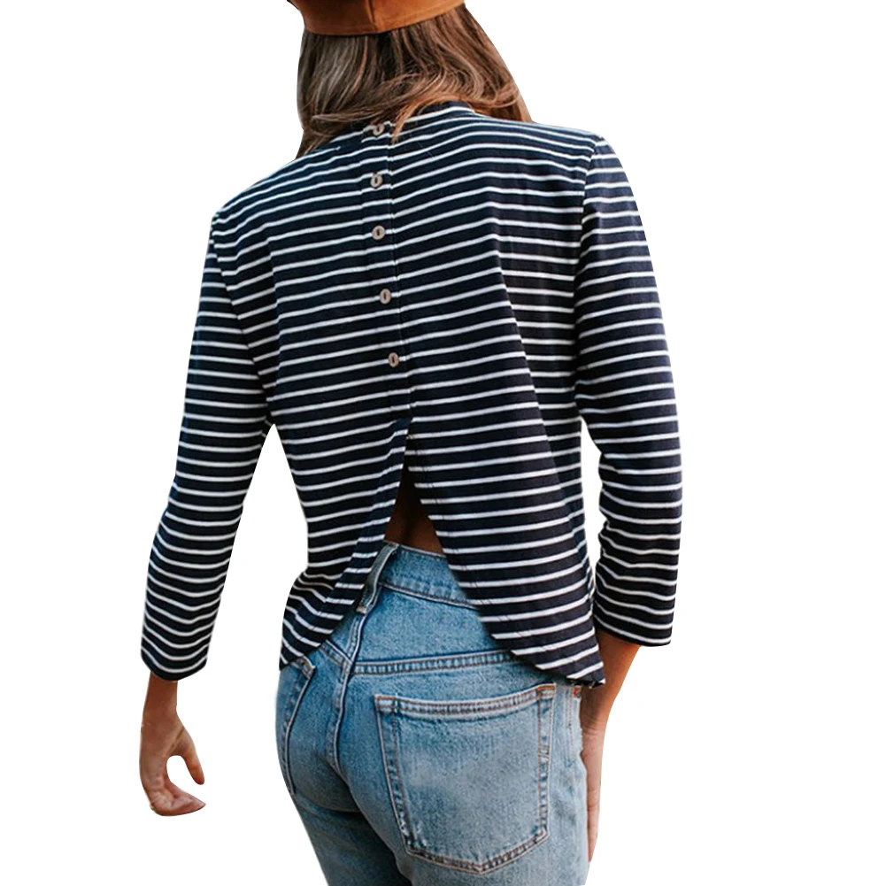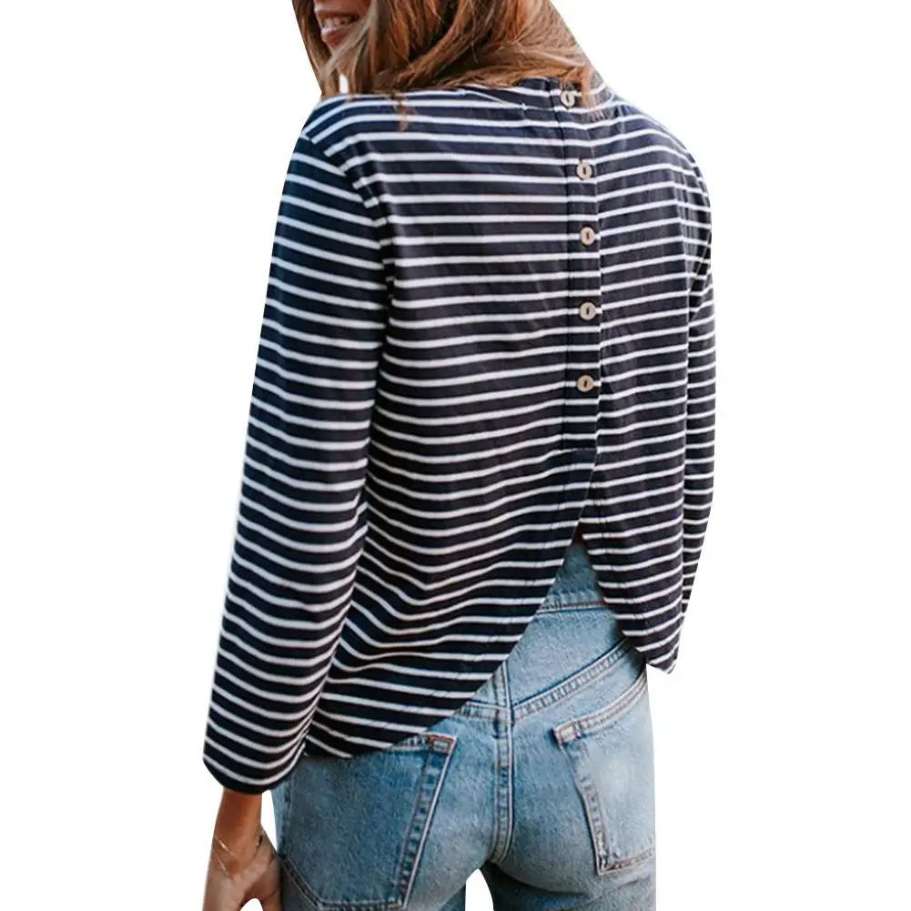 Полосатая футболка с длинными рукавами и круглым вырезом, повседневная женская футболка с пуговицами на спине, топ с разрезом