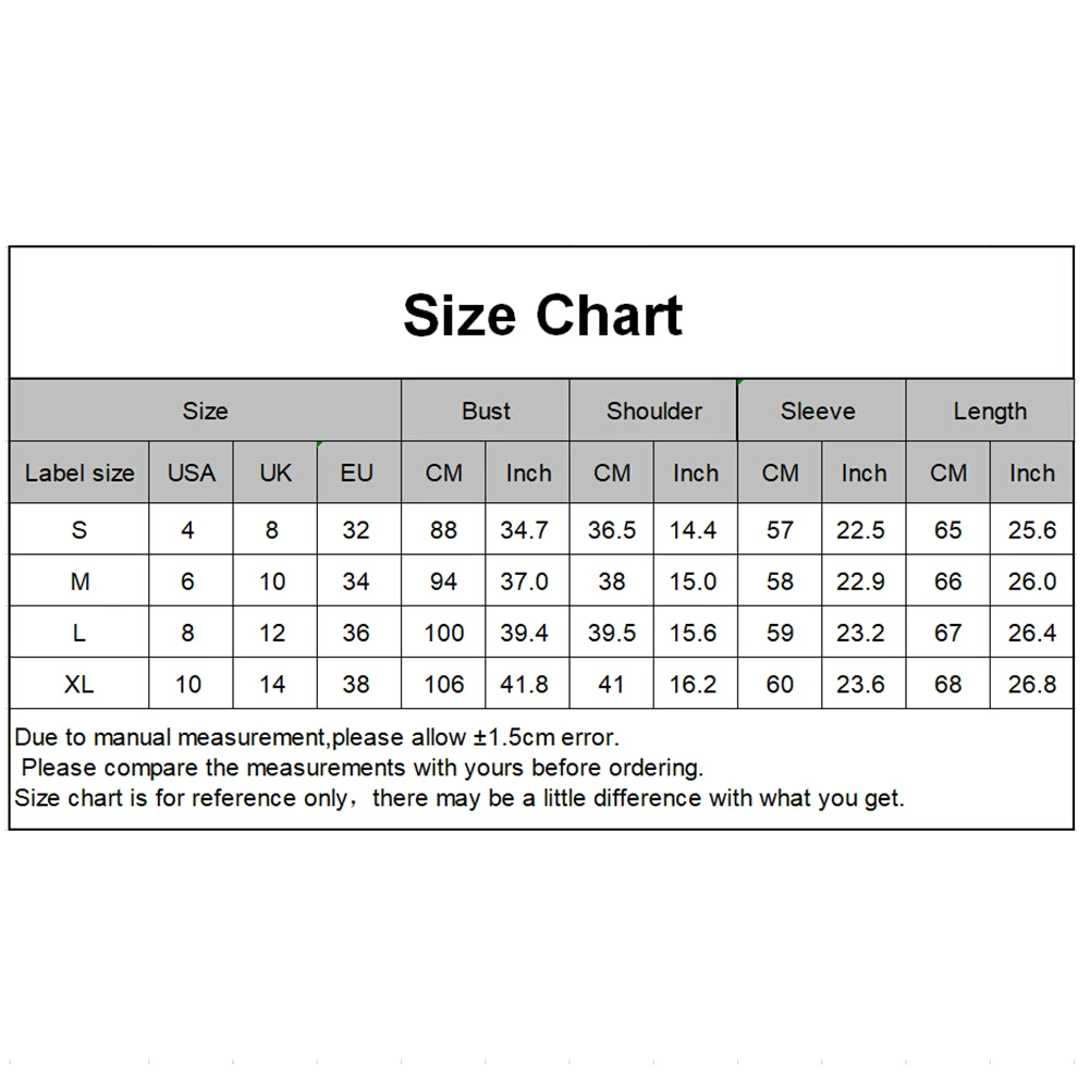 [Наш Размер S] Обхват груди: 88 см/34,65 ", плечо: 36,5 см/14,4", рукав: 57 см/22,44 ", Длина: 65 см/25,59" (прибл.)